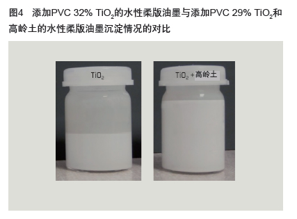 通過檢查油墨在長期貯存后的沉淀率,可驗證高嶺土在液體 油墨中的超細粒徑和良好分散性。圖4照片顯示與只含TiO2的參照 油墨相比,同時含有TiO2和研磨超細高嶺土的水性柔版油墨2周后 的沉淀率(脫水收縮作用)降低情況。