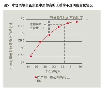 另一個感興趣的是保持配方中相同體積固含量(油墨干燥膜厚 相同),將TiO2 PVC含量維持在29%(低于非常稠密情況下的最佳 量),通過添加超細層狀高嶺土顆粒,來"間隔"TiO2顆粒。圖5表 明在PVC29% TiO2配方中高嶺土含量的增大可提高干油墨膜不透明 度。因此,僅含TiO2的配方不透明度性雖然也可以達到,但TiO2含量 要更高。圖中的虛線表示TiO2降低約10%。
