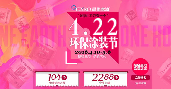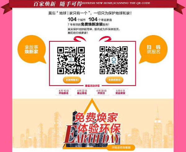 為響應綠色地球日的環保主題,4月10日起,晨陽水漆全面開啟“百城百家”活動,將聯合全國104個重點城市選出104個幸運家庭。晨陽水漆將發動經銷商、新老客戶及社會各界人士一起,打響本年度家裝服務的關鍵一槍!