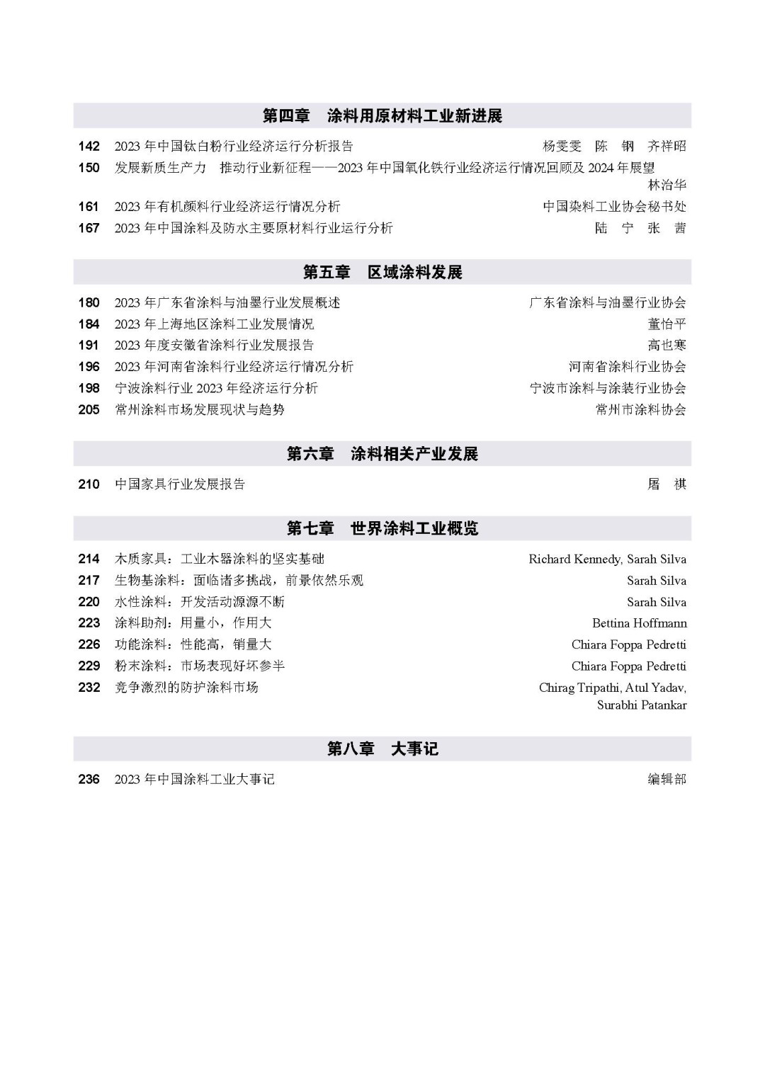 第七章,世界涂料工業概覽。收錄了2023年全球工業木器涂料、生物基涂料、水性涂料、功能涂料、粉末涂料、防護涂料、涂料助劑市場發展狀況,為國內企業了解世界涂料工業發展提供了參考。