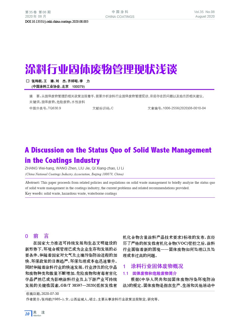 摘要:從固體廢物管理的相關政策法規著手,簡要分析涂料行業固體廢物管理現狀、目前存在的問題以及給出的相關建議。