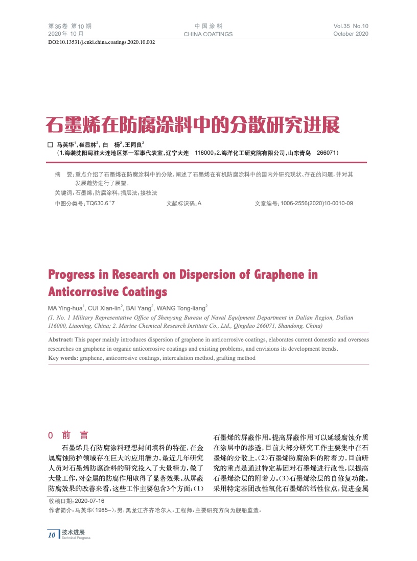 重點介紹了石墨烯在防腐涂料中的分散,闡述了石墨烯在有機防腐涂料中的國內外研究現狀、存在的問題,并對其發展趨勢進行了展望。