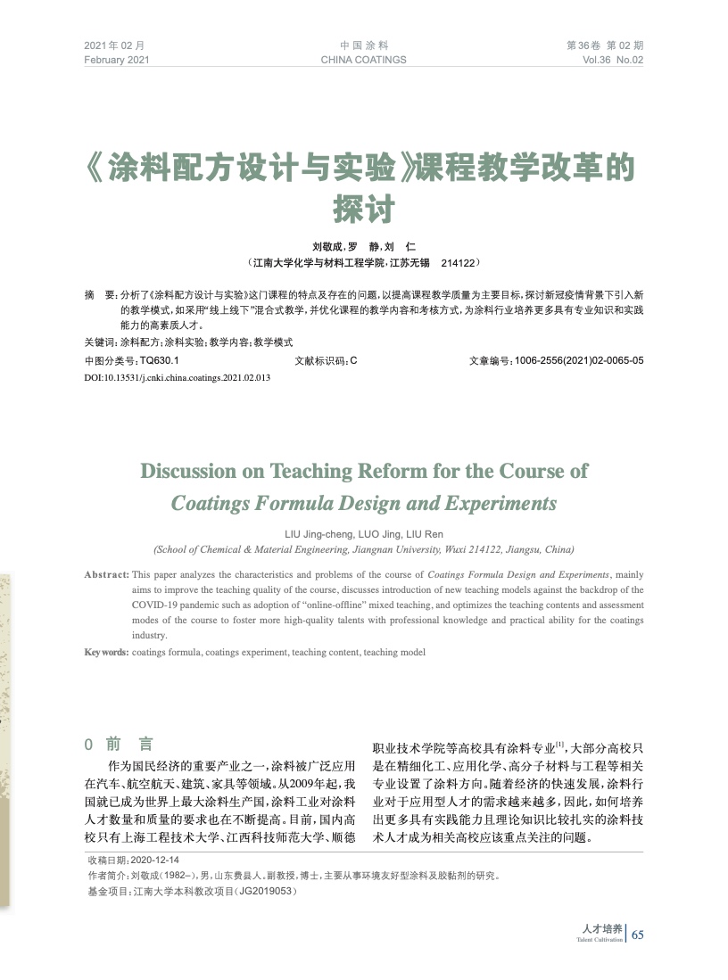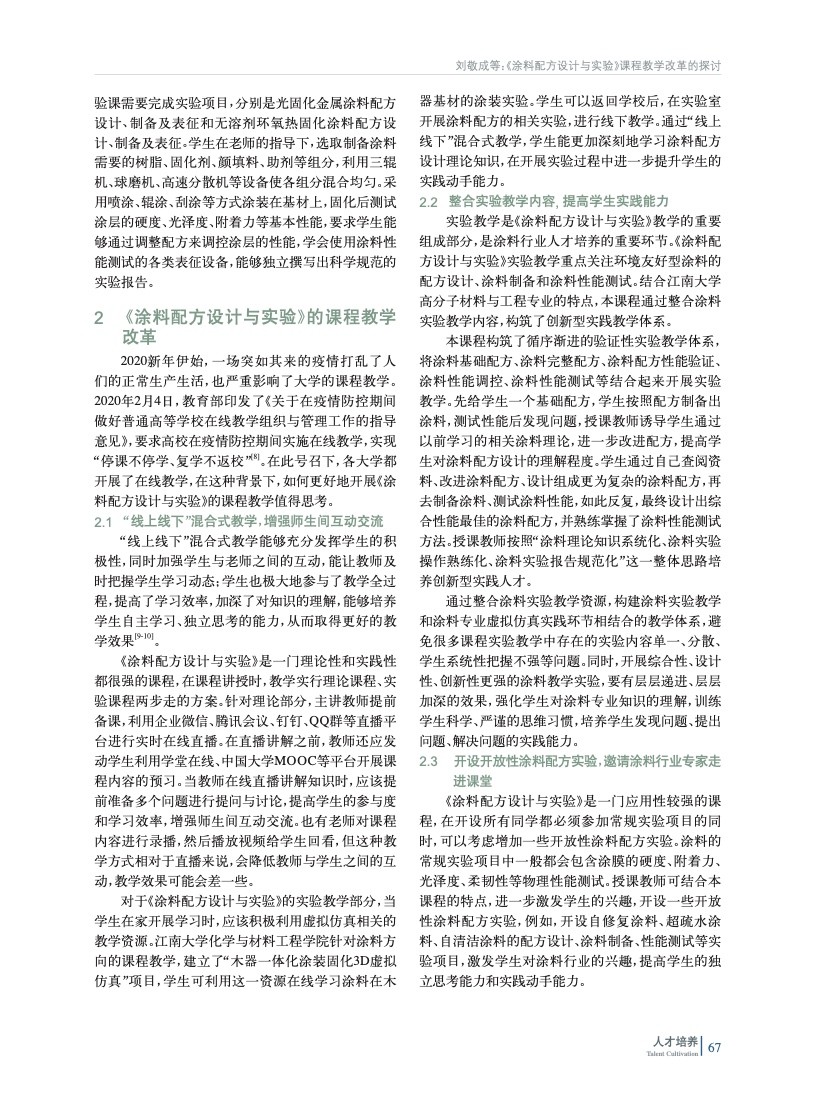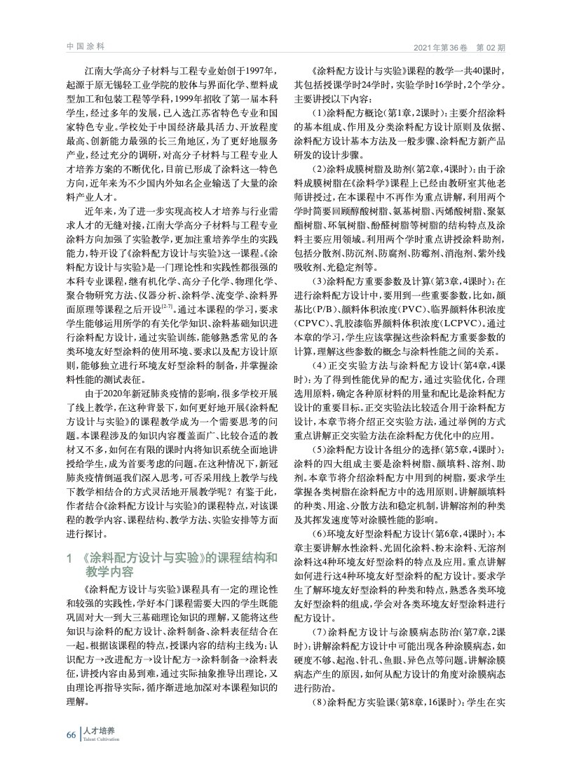 摘要:分析了《涂料配方設計與實驗》這門課程的特點及存在的問題,以提高課程教學質量為主要目標,探討新冠疫情背景下引入新的教學模式,如采用“線上線下”混合式教學,并優化課程的教學內容和考核方式,為涂料行業培養更多具有專業知識和實踐能力的高素質人才。