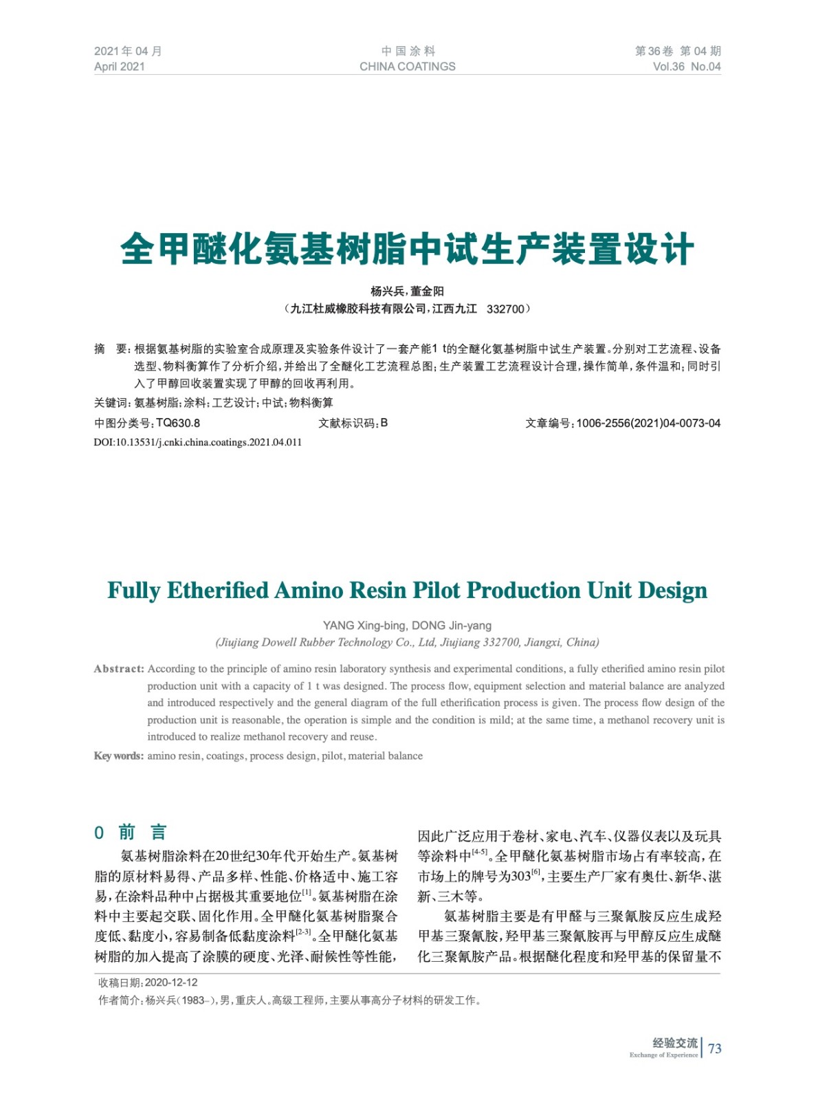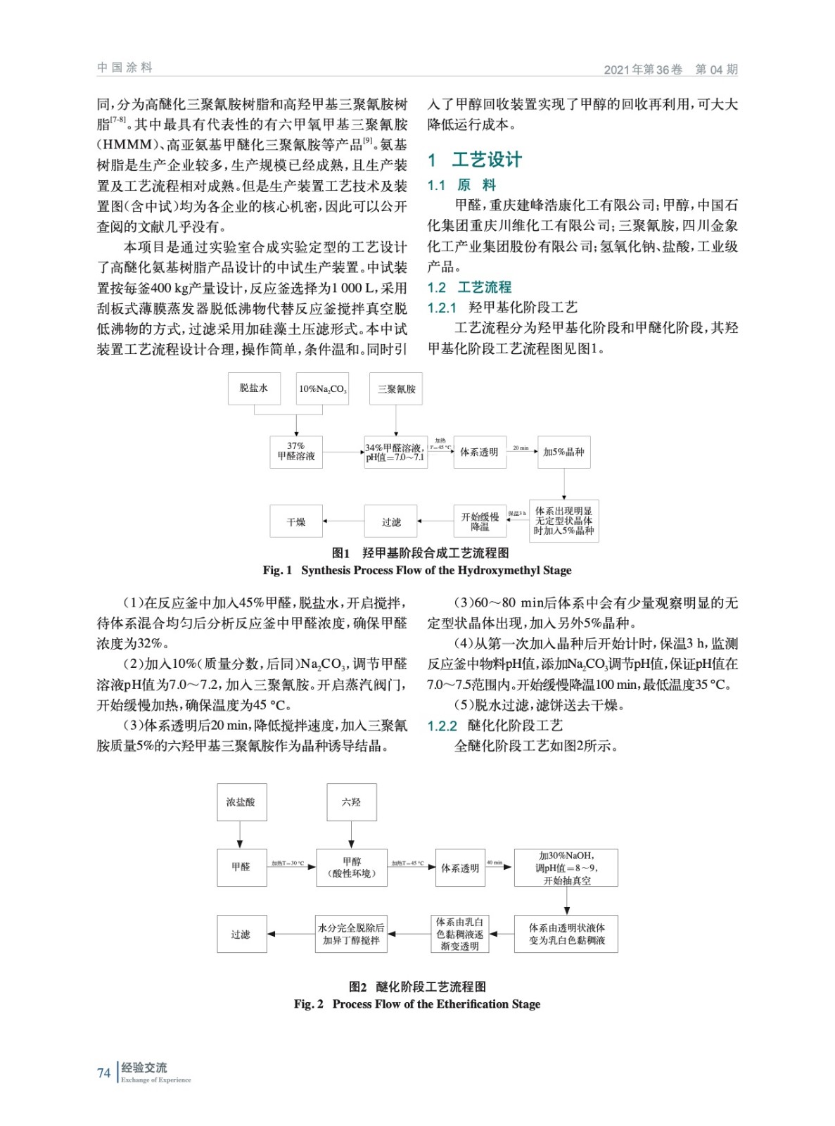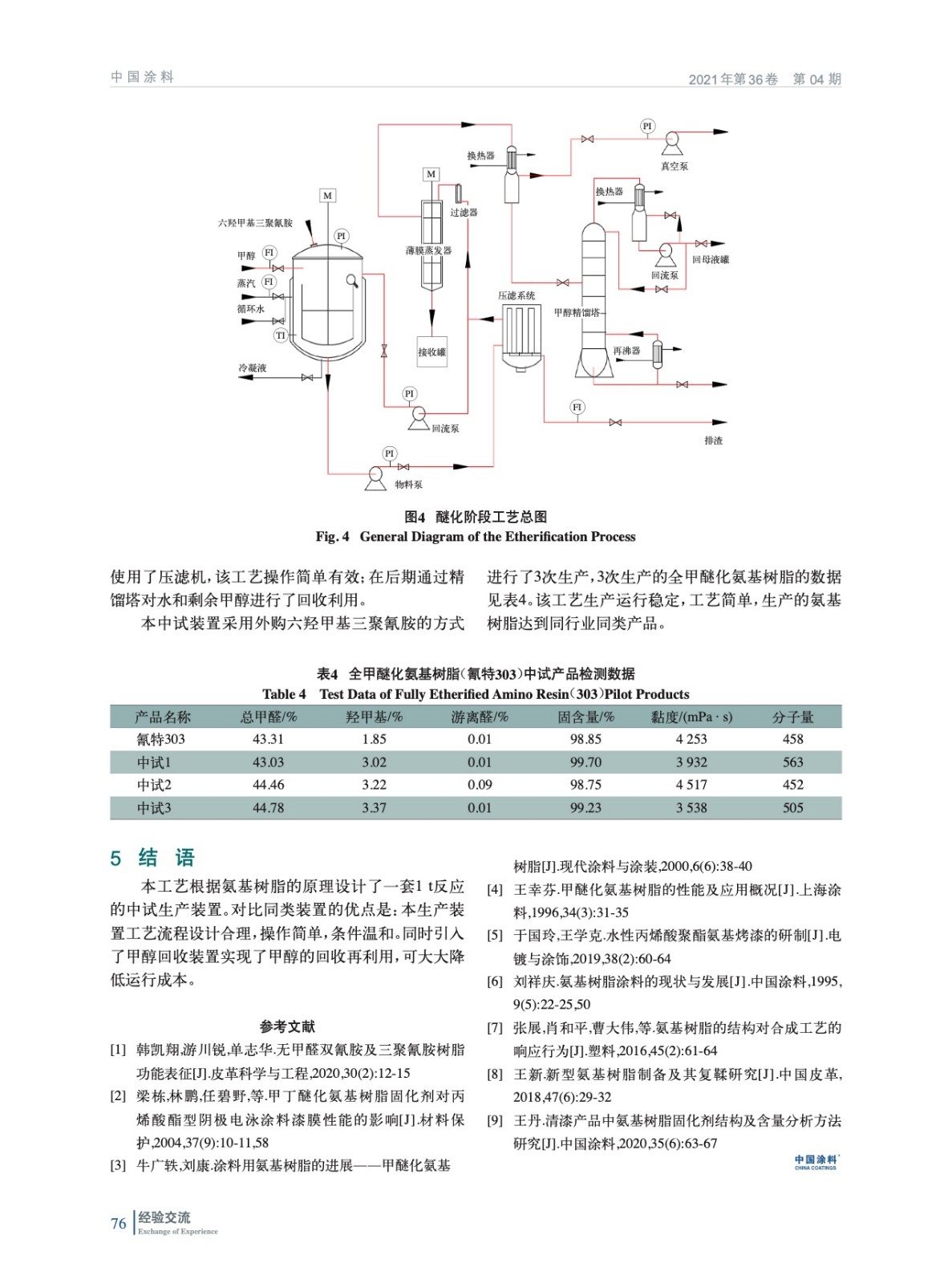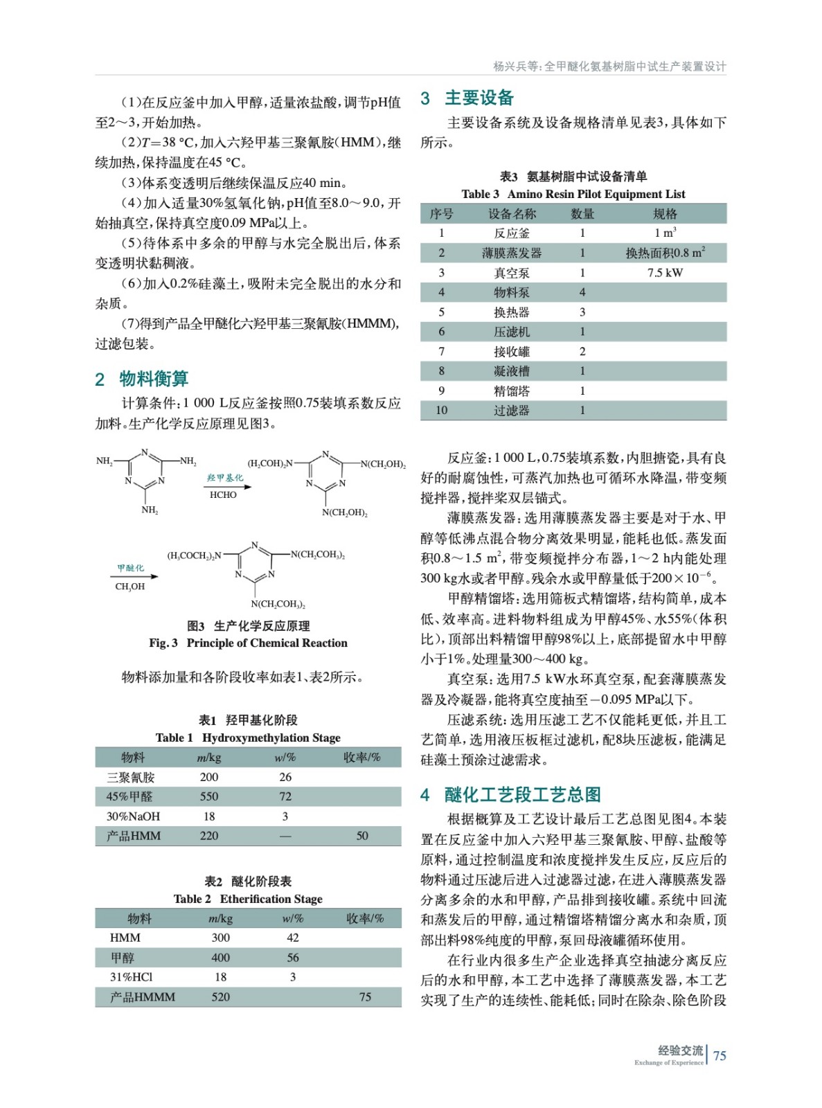 根據氨基樹脂的實驗室合成原理及實驗條件設計了一套產能1 t的全醚化氨基樹脂中試生產裝置。分別對工藝流程、設備選型、物料衡算作了分析介紹,并給出了全醚化工藝流程總圖;生產裝置工藝流程設計合理,操作簡單,條件溫和;同時引入了甲醇回收裝置實現了甲醇的回收再利用。
