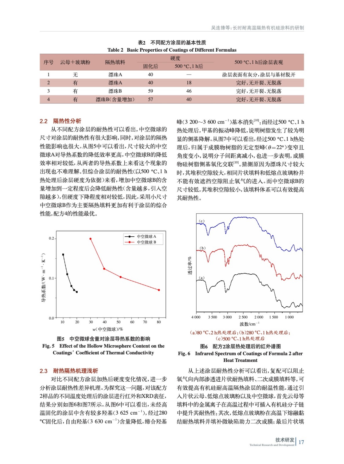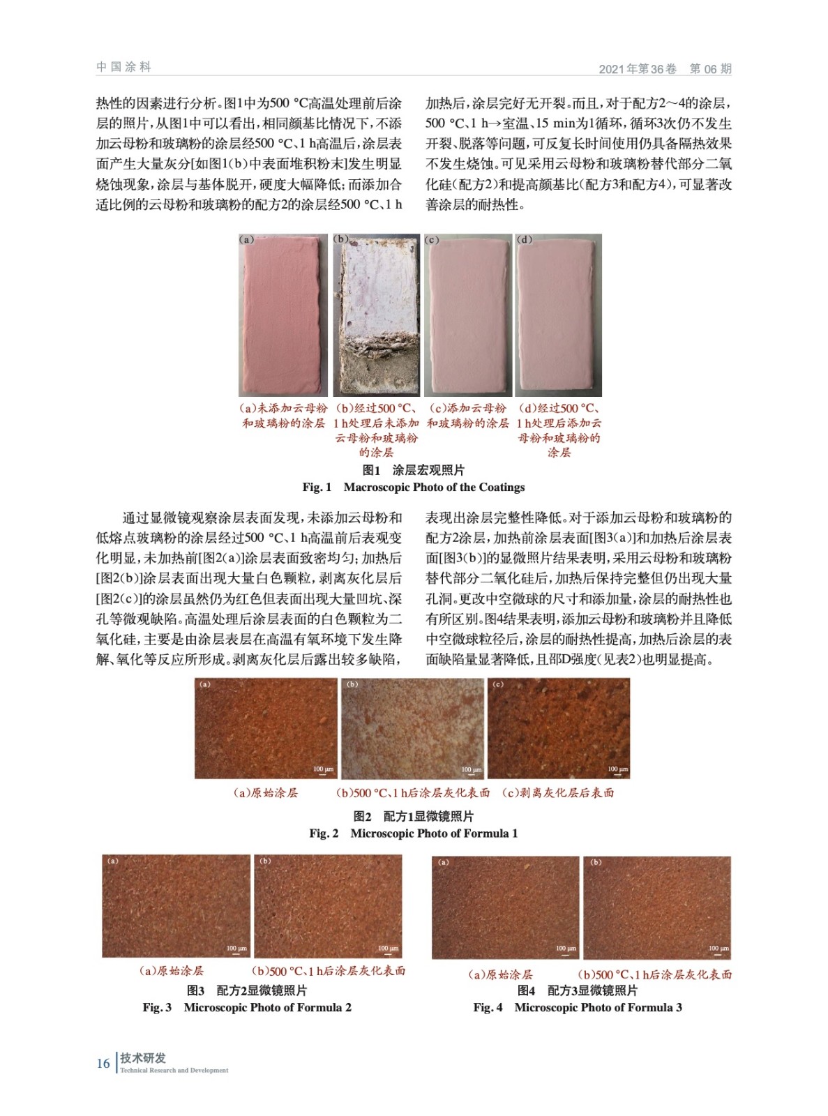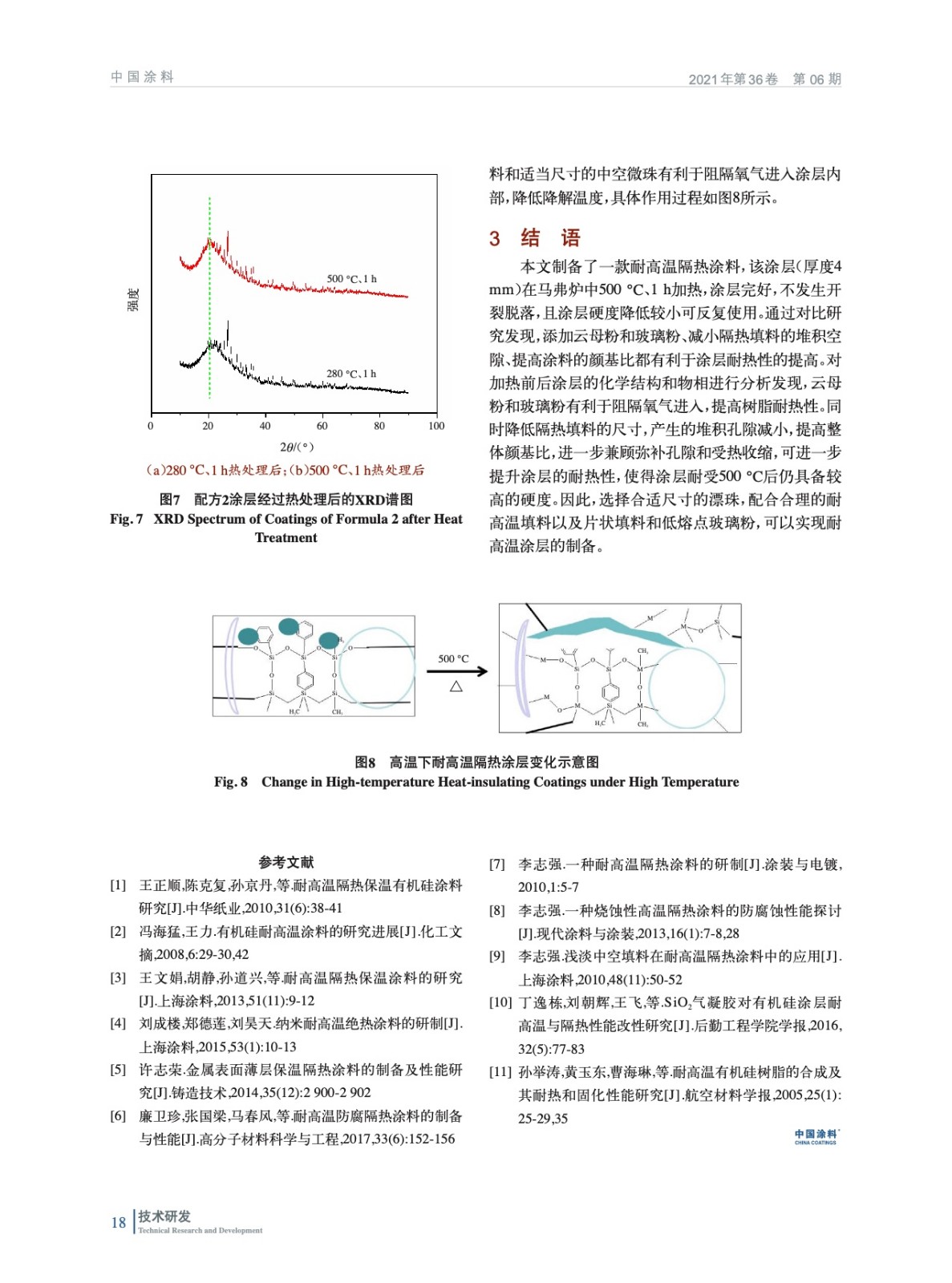 摘要:以有機硅為成膜物,復配高效隔熱填料和增強填料等,制備了一種可以耐受500 ℃、1 h,且不發生起泡、開裂、脫落可反復使用的耐高溫隔熱有機涂料。對涂層進行測試,發現該涂層具備良好的耐熱性。復配高效隔熱填料質量分數為80%時,涂層具有良好的隔熱性能。并且,對涂層的耐高溫隔熱的原理進行了分析,發現耐熱填料、助溶劑和隔熱填料等有效復配是涂層耐熱隔熱的關鍵。