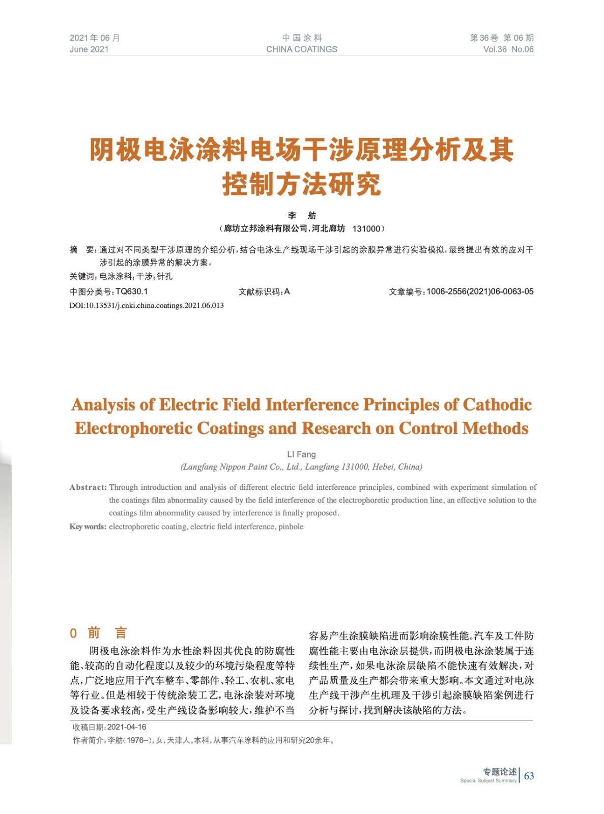 陰極電泳涂料電場干涉原理分析及其控制方法研究