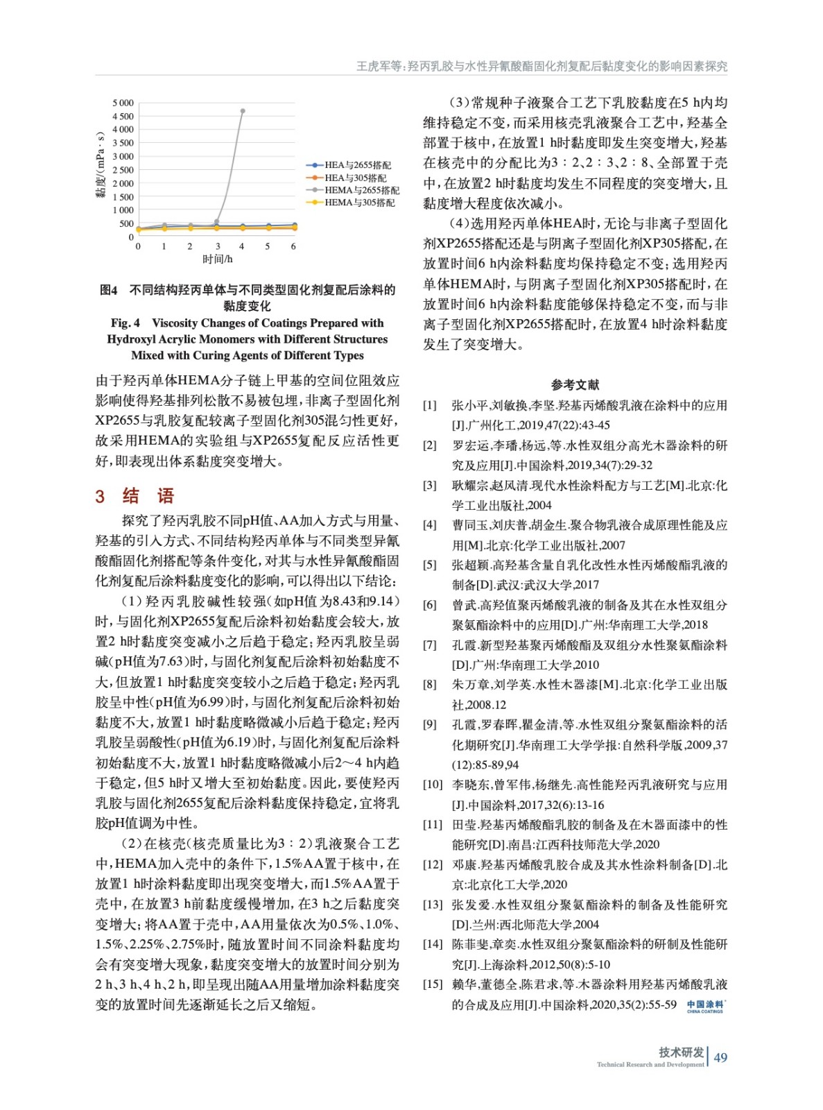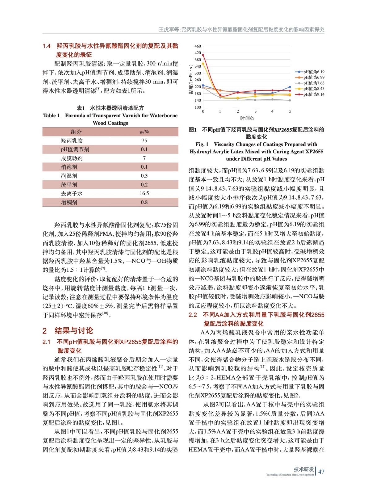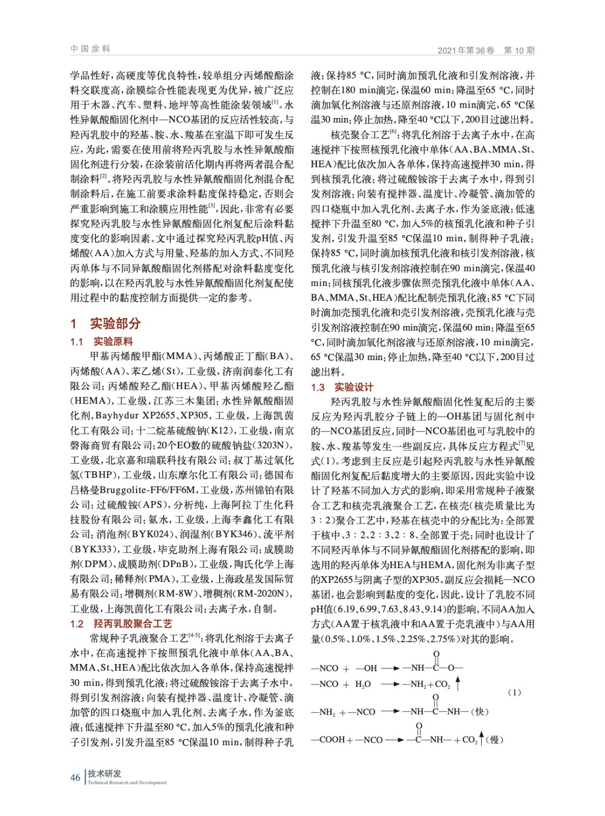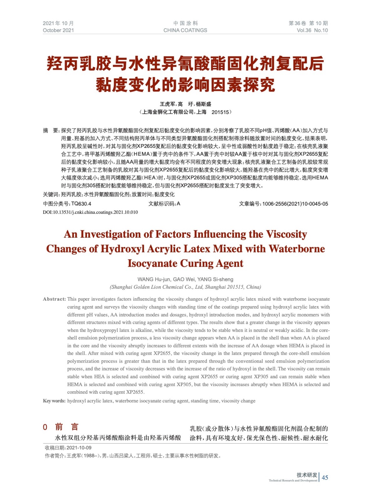 摘要:探究了羥丙乳膠與水性異氰酸酯固化劑復配后黏度變化的影響因素,分別考察了乳膠不同pH值、丙烯酸(AA)加入方式與用量、羥基的加入方式、不同結構羥丙單體與不同類型異氰酸酯固化劑搭配制得涂料隨放置時間的黏度變化。
