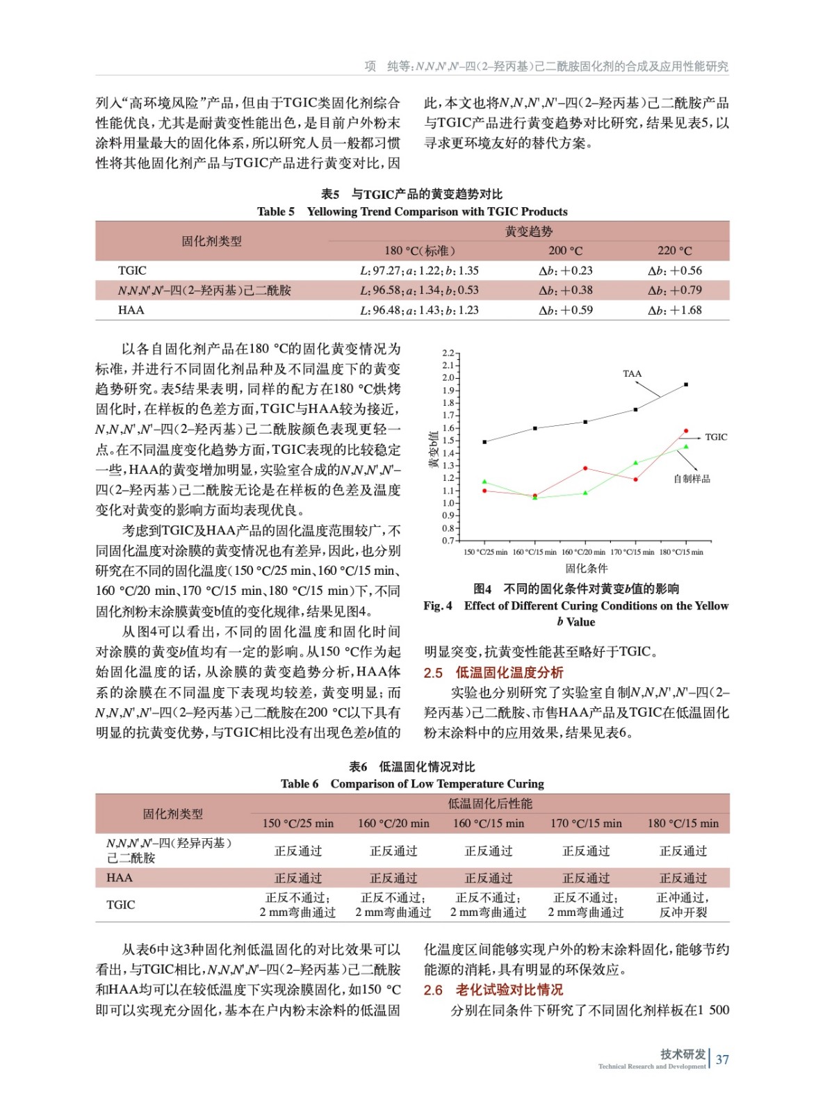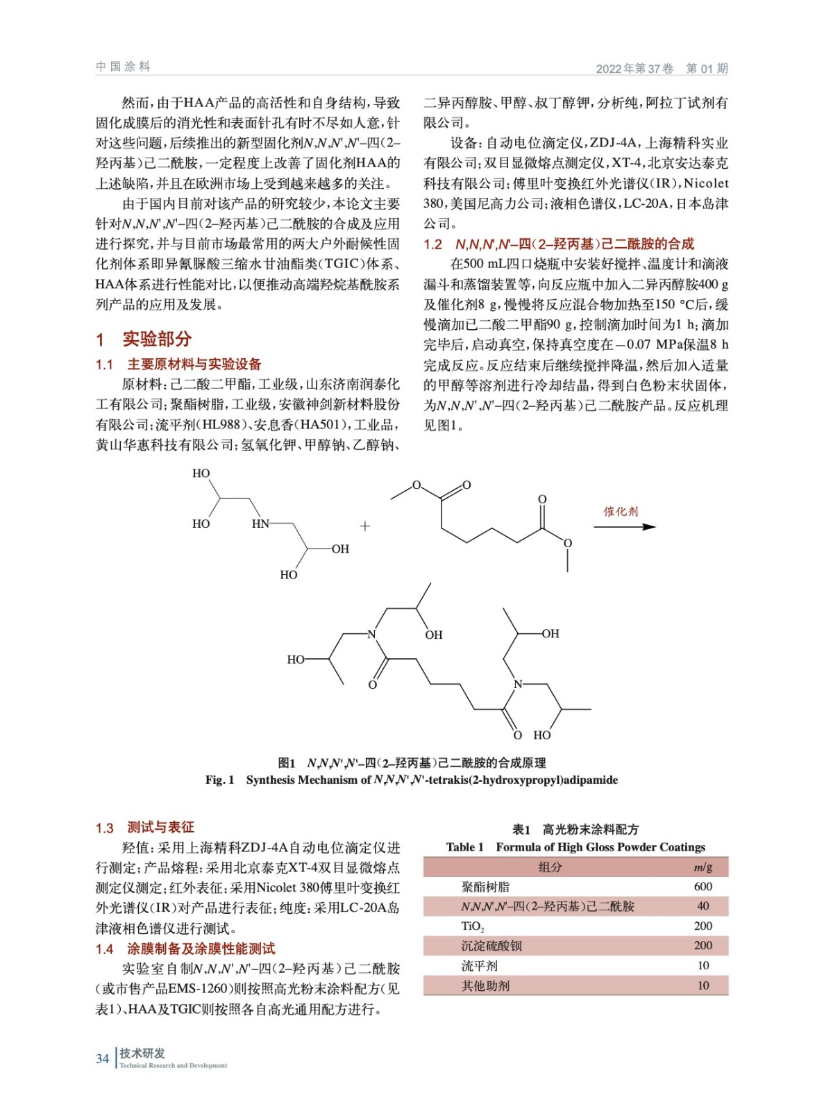 摘要:采用己二酸二甲酯和二異丙醇胺為主要原料合成了N,N,N',N'–四(2–羥丙基)己二酰胺固化劑,借助液相、紅外光譜對產品進行了表征。并對比研究了N,N,N',N'–四(2–羥丙基)己二酰胺作為固化劑產品與市售固化劑EMS-1260、HAA、TGIC產品在耐黃變、低溫固化、耐老化等方面的應用性能。
