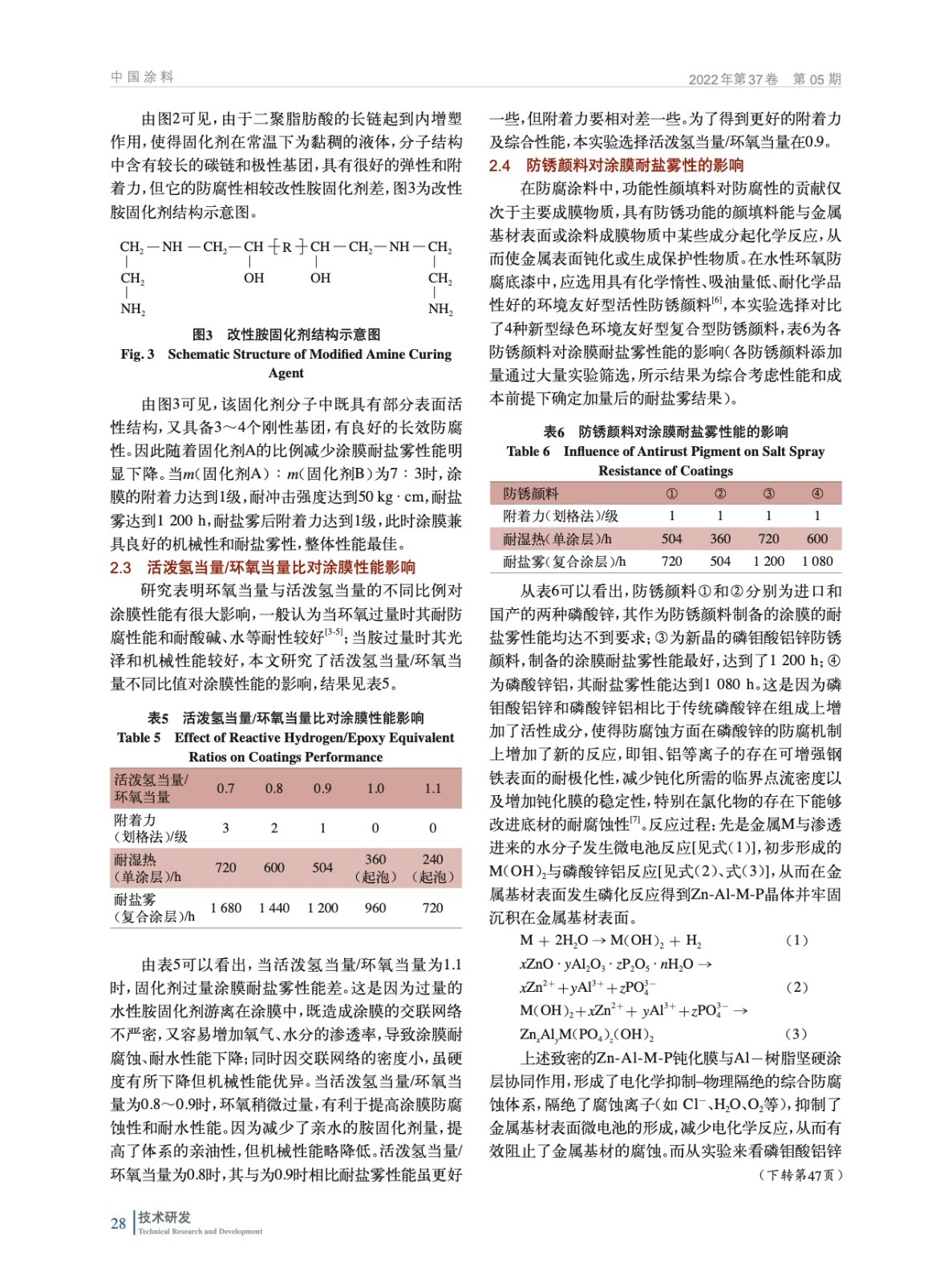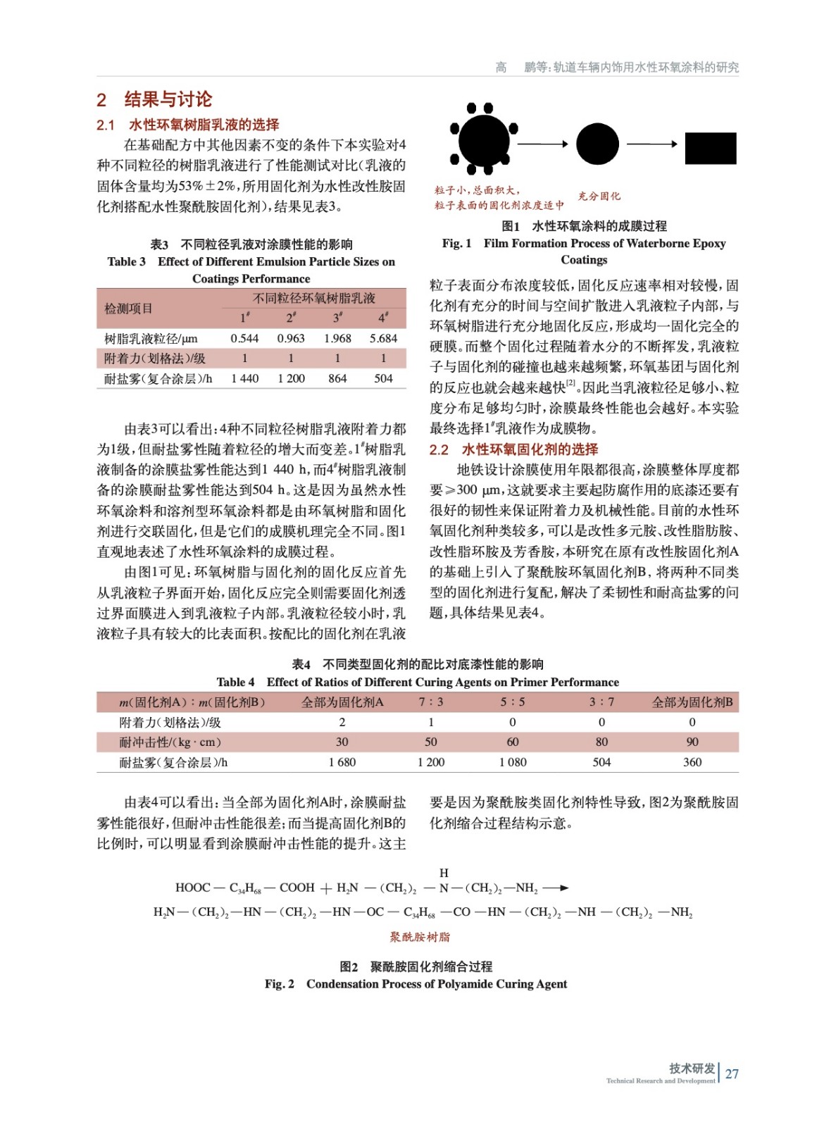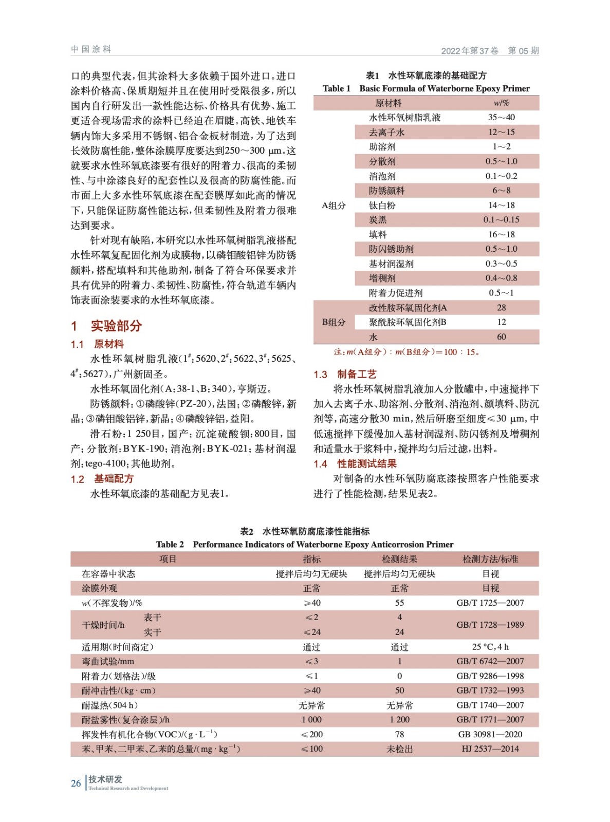 摘要:以小粒徑環氧樹脂乳液搭配改性胺和聚酰胺復配固化劑為主要成膜物,選用磷鉬酸鋁鋅為防銹顏料制備了符合環保要求并滿足軌道車輛內飾表面涂裝要求的水性環氧涂料??疾旖Y果表明:活潑氫當量與環氧當量比選擇0.9,并且搭配磷鉬酸鋁鋅作為防銹顏料制備的涂料滿足要求,適用于較難附著的不銹鋼、鋁合金等多種金屬基材的防腐保護。