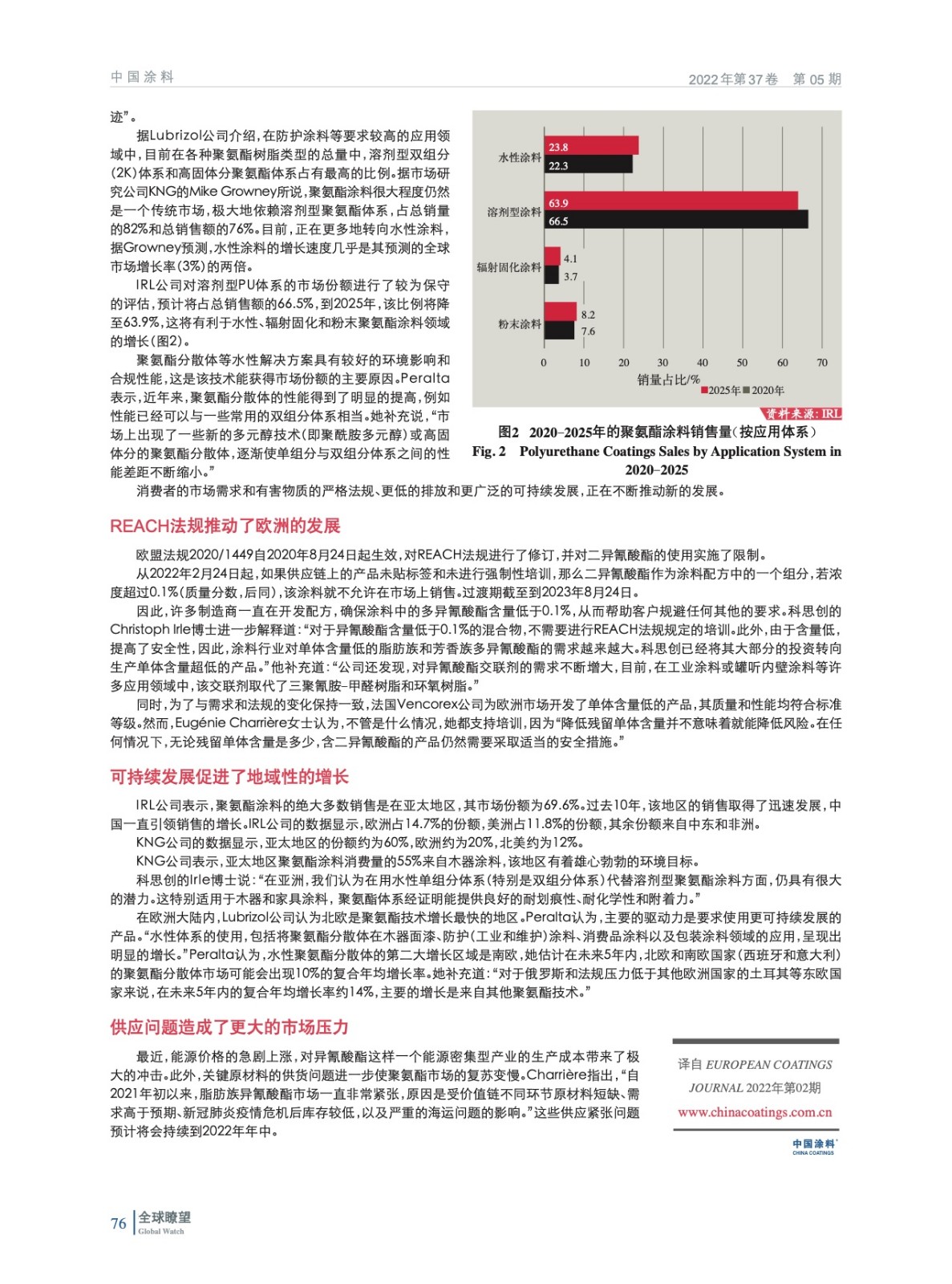編者按:市場研究公司IRL的José Bottino認為,2020年,聚氨酯涂料的全球銷售量為590萬t,約占涂料銷售總量(5 360萬t)的11%,銷售額為280億歐元。預計到2025年,其全球銷量將增至760萬t,占市場總量的11.7%。