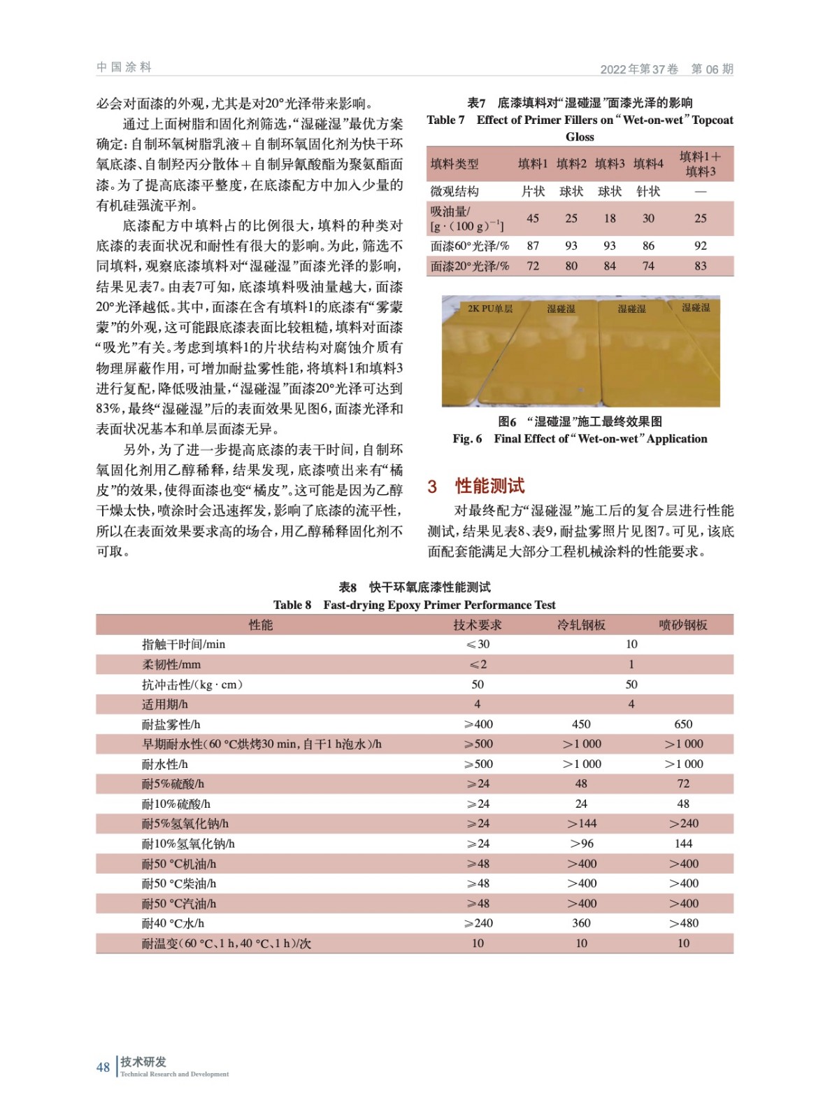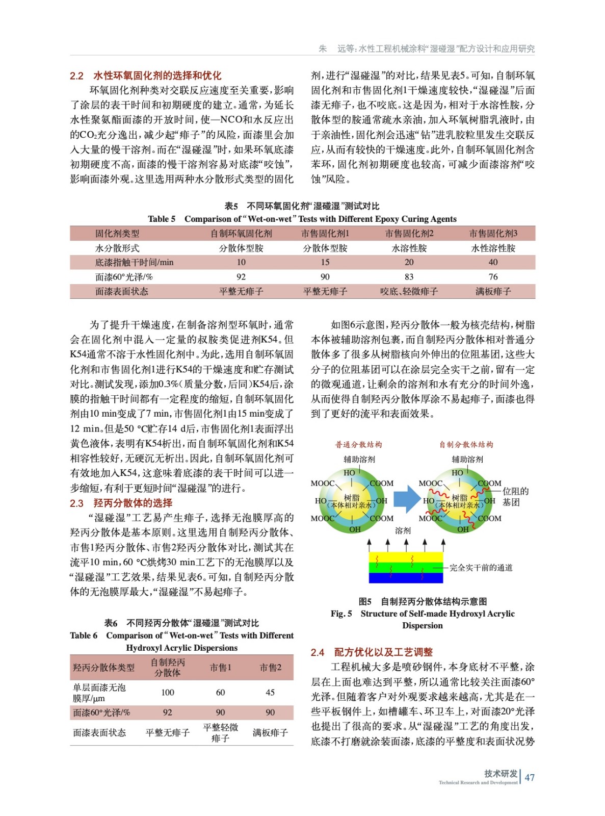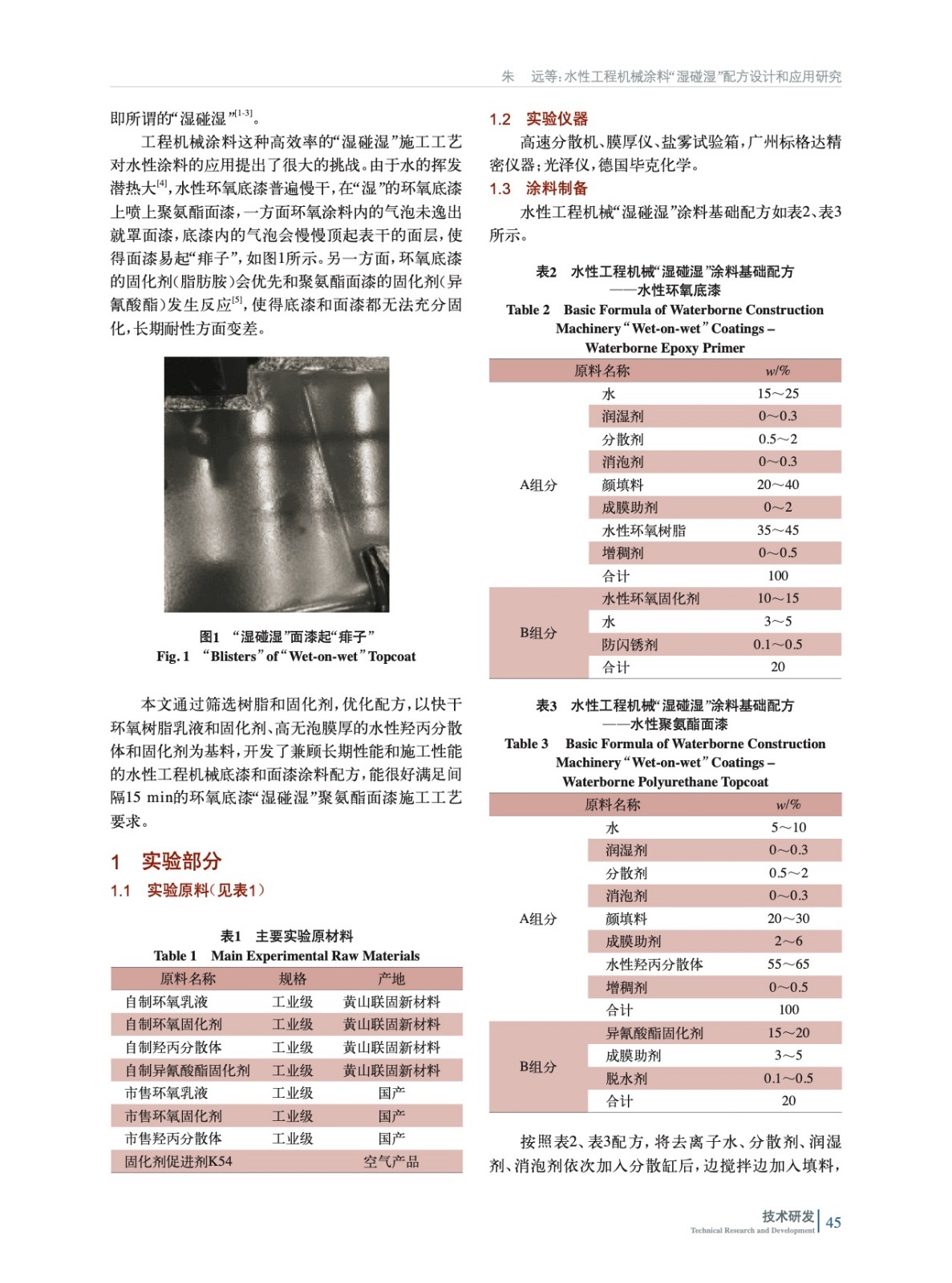 摘要:通過使用快干的水性環氧樹脂和固化劑、高無泡膜厚的水性羥丙分散體和固化劑,并通過配方優化,開發了兼顧長期性能和施工性能的水性工程機械底漆和面漆涂料配方,能滿足間隔15 min的環氧底漆“濕碰濕”聚氨酯面漆施工工藝要求。