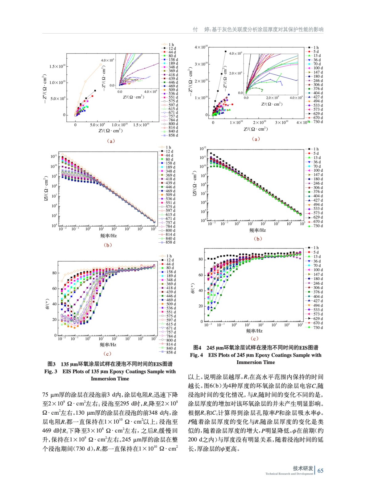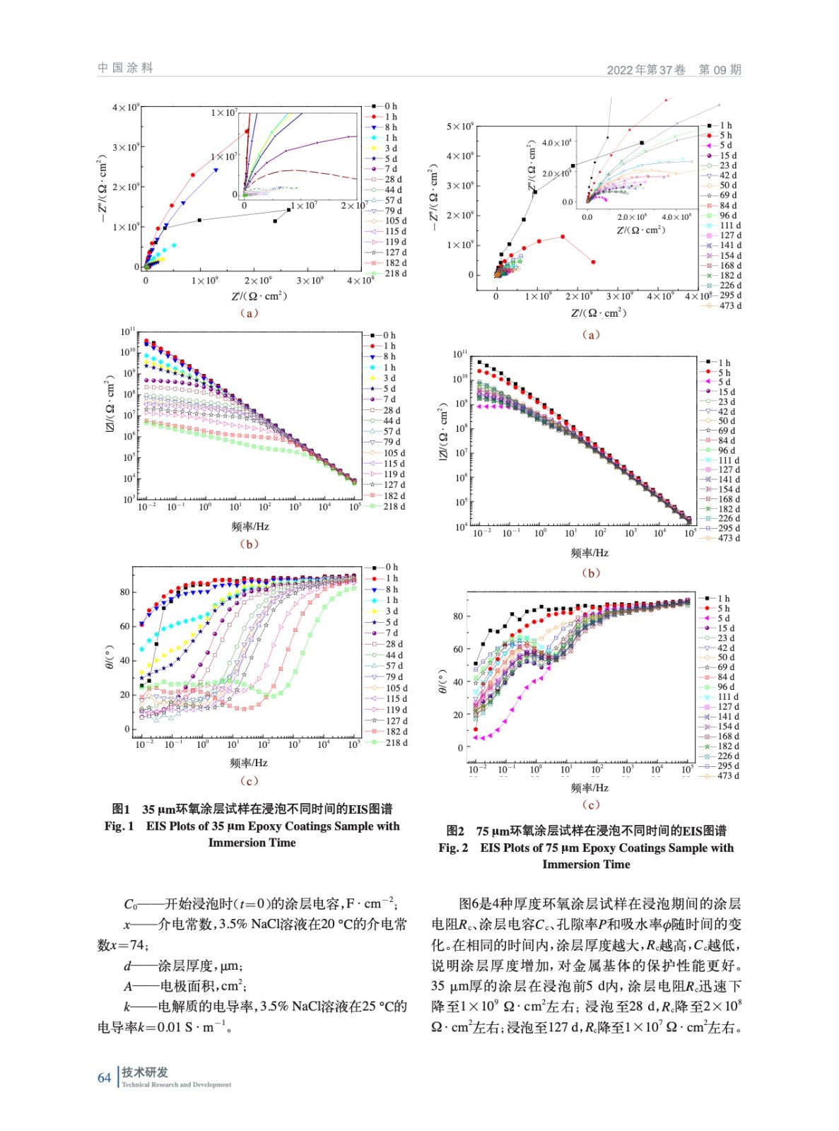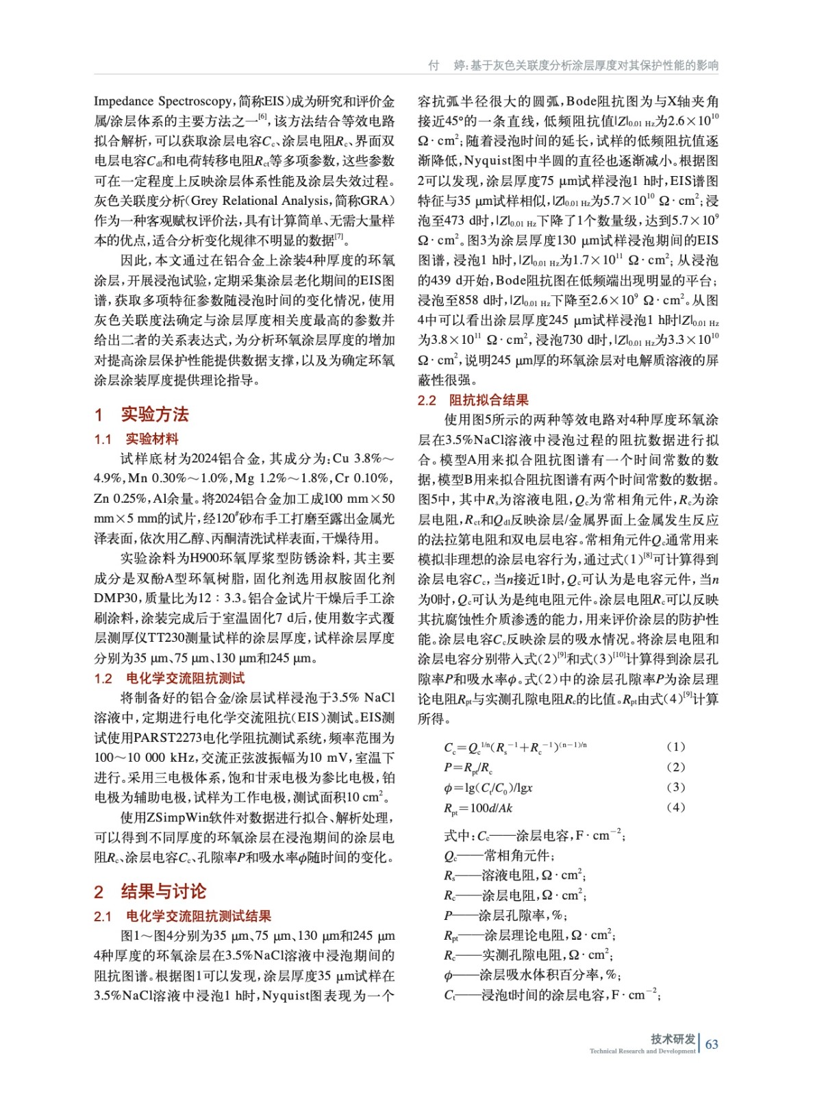 摘要:在2024鋁合金表面涂裝不同厚度的H900環氧涂層,將環氧涂層/鋁合金試樣浸泡于質量分數3.5%的氯化鈉溶液中,定期進行電化學交流阻抗測試,對阻抗數據進行解析,分析涂層的劣化過程,研究涂層厚度的增加對涂層保護性能的影響。實驗結果表明,在相同的時間內,涂層厚度越大,涂層電阻Rc越高,孔隙率P越低,說明涂層厚度增加,對金屬基體的保護性能更好。