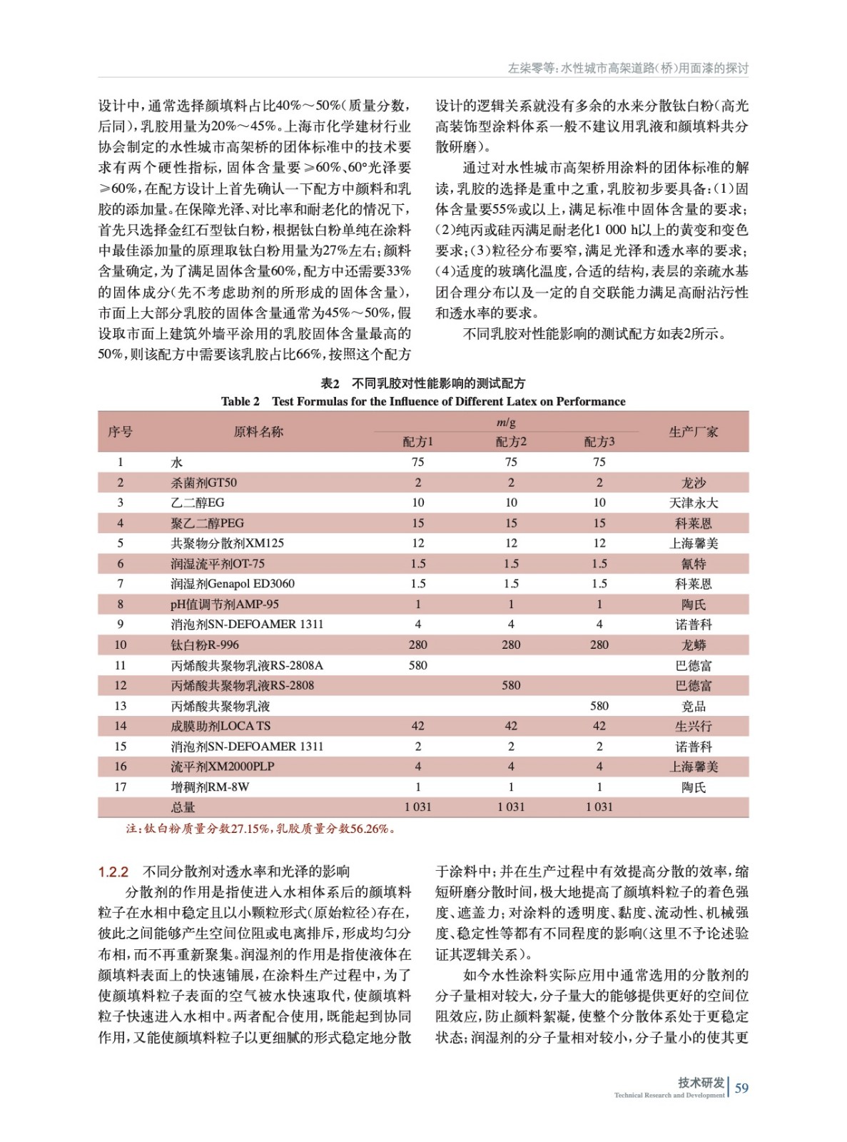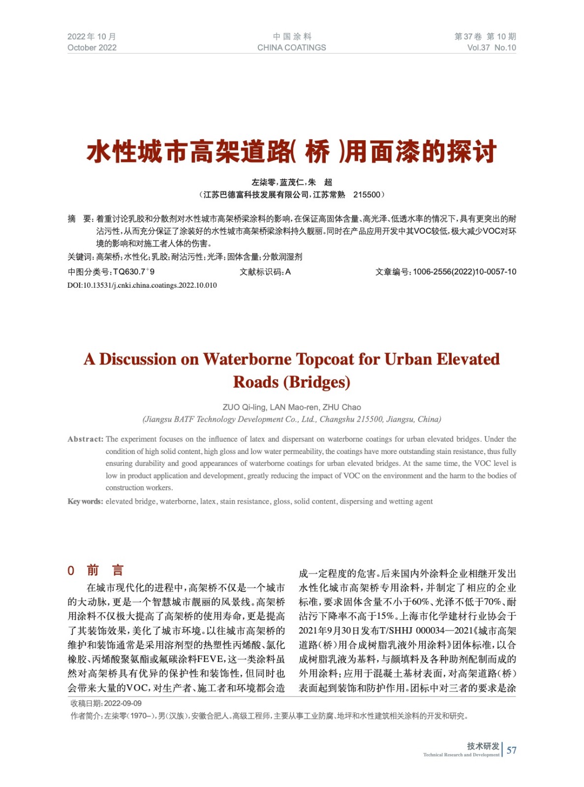 摘要:著重討論乳膠和分散劑對水性城市高架橋梁涂料的影響,在保證高固體含量、高光澤、低透水率的情況下,具有更突出的耐沾污性,從而充分保證了涂裝好的水性城市高架橋梁涂料持久靚麗。同時在產品應用開發中其VOC較低,極大減少VOC對環境的影響和對施工者人體的傷害。