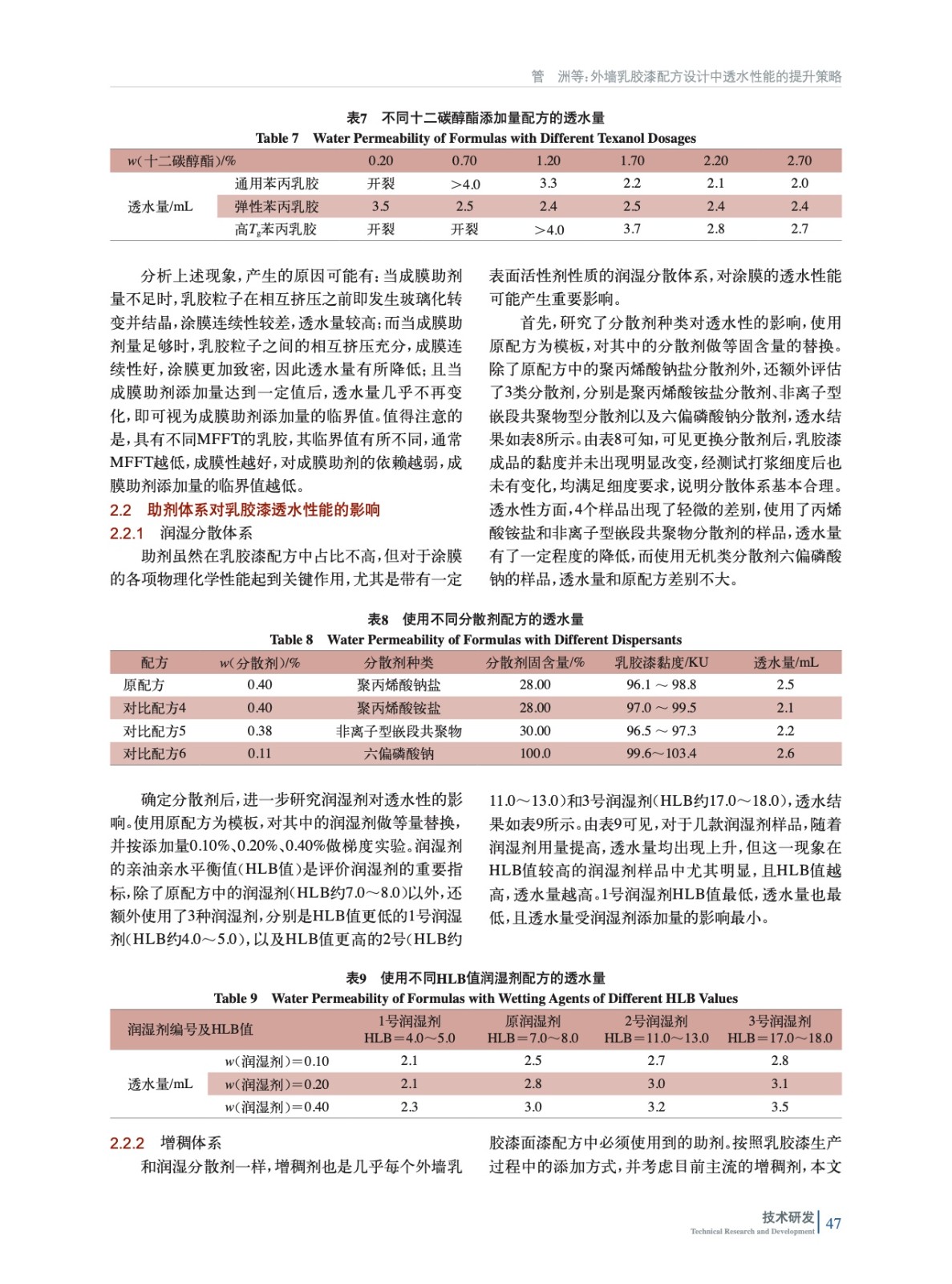 摘要:研究了成膜體系、助劑體系和無機填料對乳膠漆透水性能的影響。結果表明:成膜體系方面,使用小粒徑乳膠,提高乳膠用量并搭配少量的蠟乳液、提高成膜助劑用量可有助于改善涂層的成膜效果,進而改善透水性;助劑方面,使用銨鹽分散劑替代鈉鹽分散劑、使用更低HLB值的潤濕劑、使用疏水改性聚氨酯增稠劑替代堿溶脹增稠劑,并加入少量的遮蓋聚合物,均有助于改善透水性;無機填料方面,使用粗細搭配的填料體系,并盡可能使用片狀填料,也可一定程度改善透水性。根據實驗結論和總結的涂膜透水及改進模型,可為乳膠漆透水性能的提升給出配方優化建議,并驗證了改良后的配方能夠有效降低涂膜的透水量,使其達到外墻面漆合格品的指標,可為低成本、低透水的外墻乳膠漆配方設計提供思路。