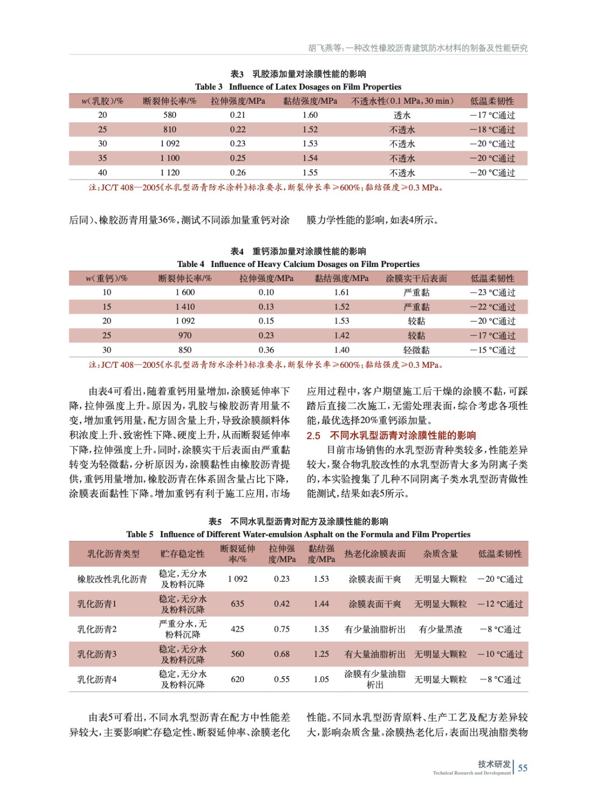 摘要:為了改善水乳型瀝青建筑防水涂料熱黏冷脆的缺點,自制了Tg為-21 ℃的高彈均相苯丙乳膠,探討了聚合物乳液、乳化瀝青的種類及添加量、重鈣的添加量對防水涂膜性能的影響。用掃描電鏡對防水涂層的微觀結(jié)構(gòu)進行了分析,用差熱分析儀DSC、高低溫恒溫恒濕箱、萬能材料試驗機、電動不透水儀等對防水涂層的玻璃化溫度、低溫柔韌性、耐熱度、機械性能、防滲透性能等進行測試。結(jié)果表明,當添加自制苯丙乳膠30%(質(zhì)量分數(shù),后同)、橡膠乳化瀝青36%、重鈣20%時,制備的液體防水涂料涂膜斷裂伸長率為1 092%,低溫柔韌性通過-20 ℃,120 ℃無流淌、滑動。