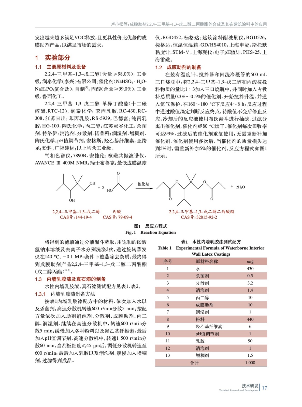 成膜助劑2,2,4–三甲基–1,3–戊二醇二丙酸酯的合成及其在建筑涂料中的應用