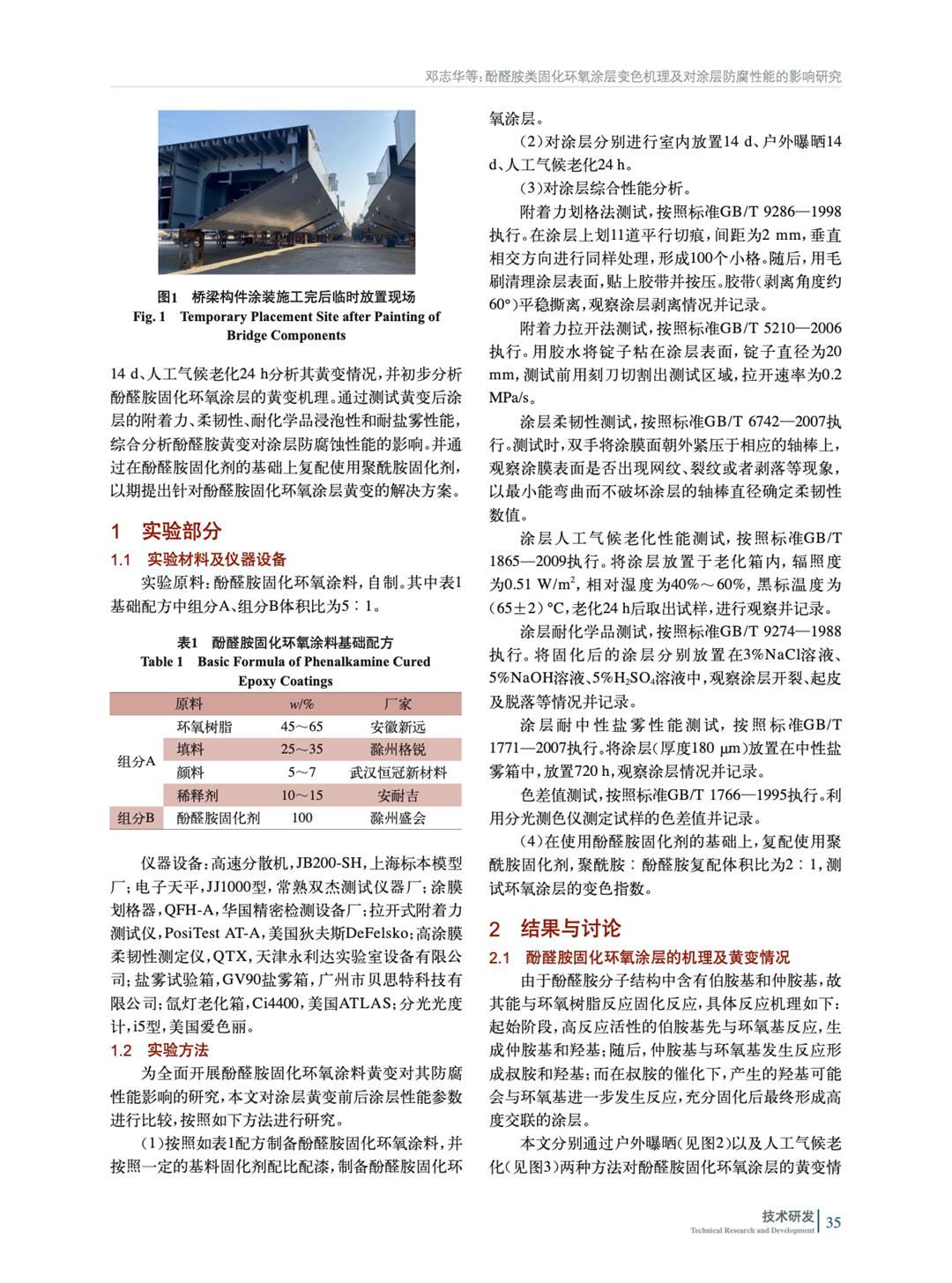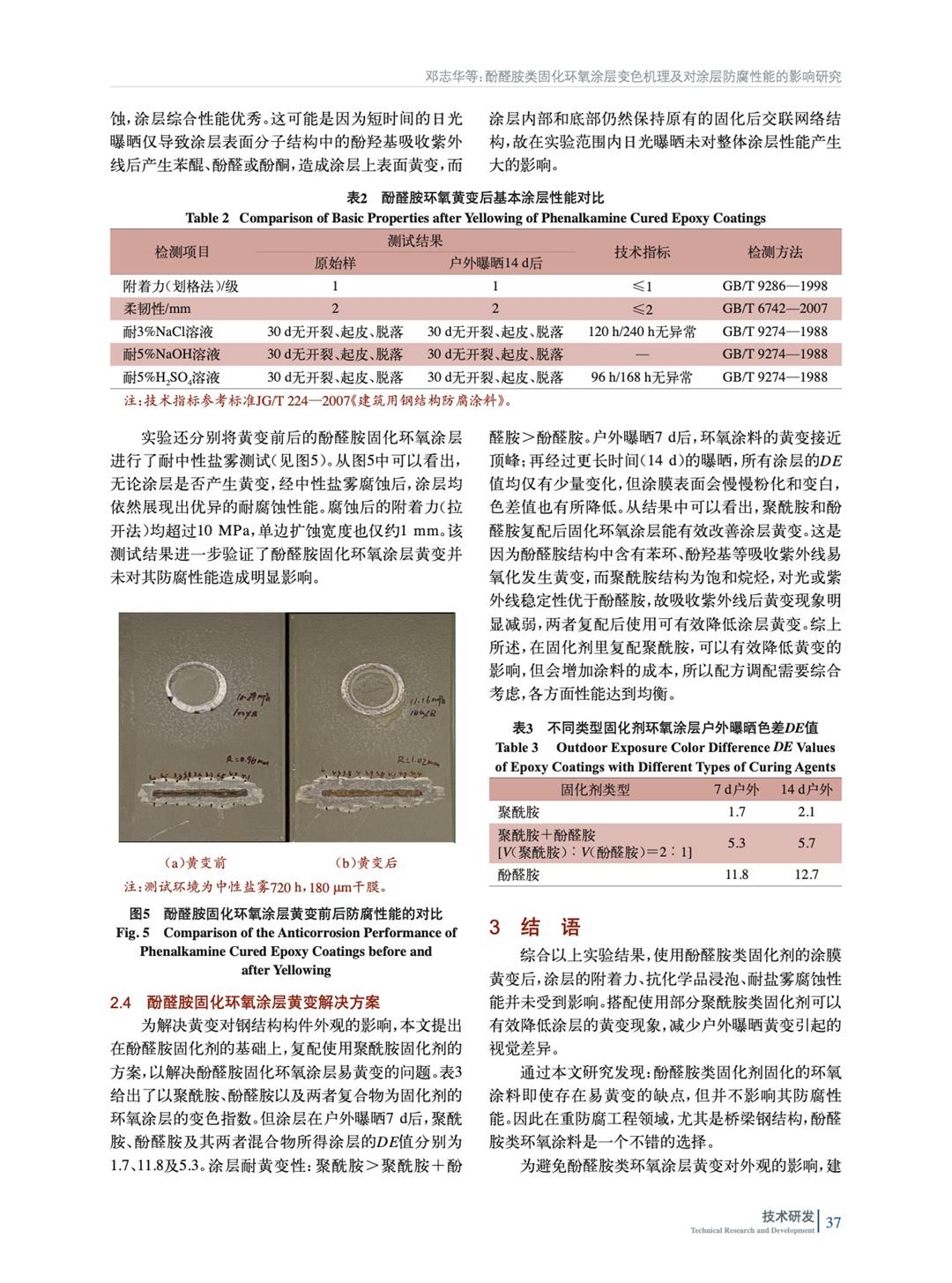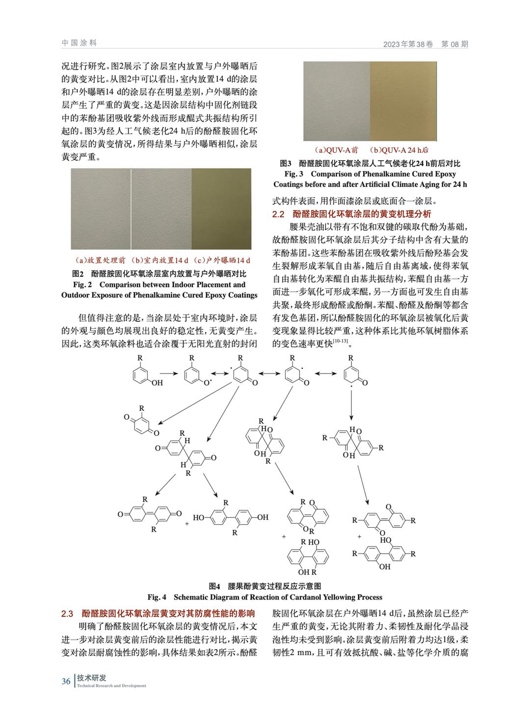 酚醛胺固化環氧涂層因為酚醛胺本身特性,它在自然曝曬下耐黃變性較差,一定程度上影響外觀,因此對酚醛胺變色機理開展研究,驗證其變色對其防腐性能的影響,并提出相應解決方案。