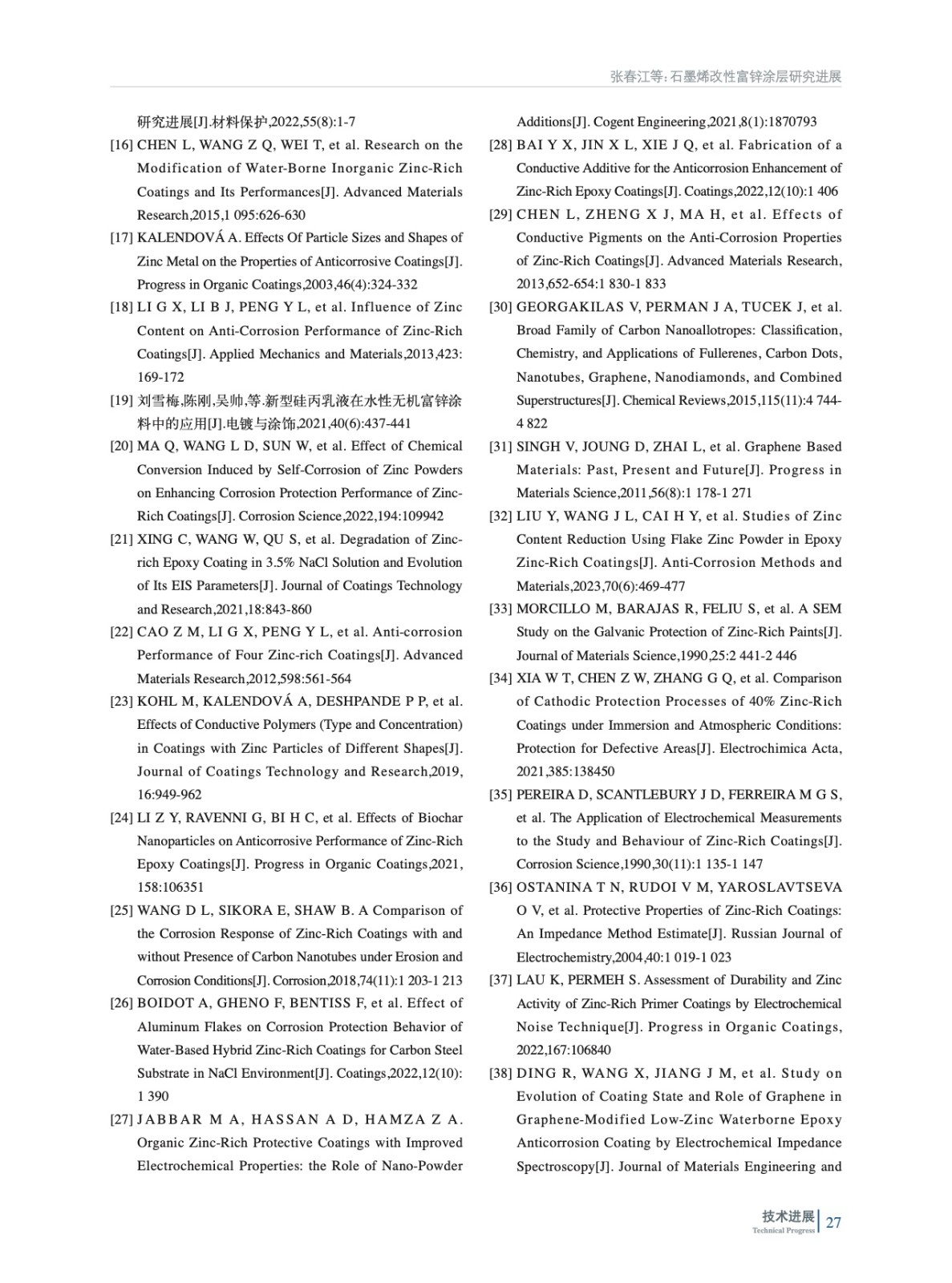 摘要:綜述了近年來(lái)石墨烯改性富鋅涂層國(guó)內(nèi)外的研究進(jìn)展,簡(jiǎn)要討論了富鋅涂層及石墨烯改性富鋅涂層的基本防腐蝕機(jī)理、性能評(píng)價(jià)、面臨的挑戰(zhàn)和未來(lái)的研究方向。