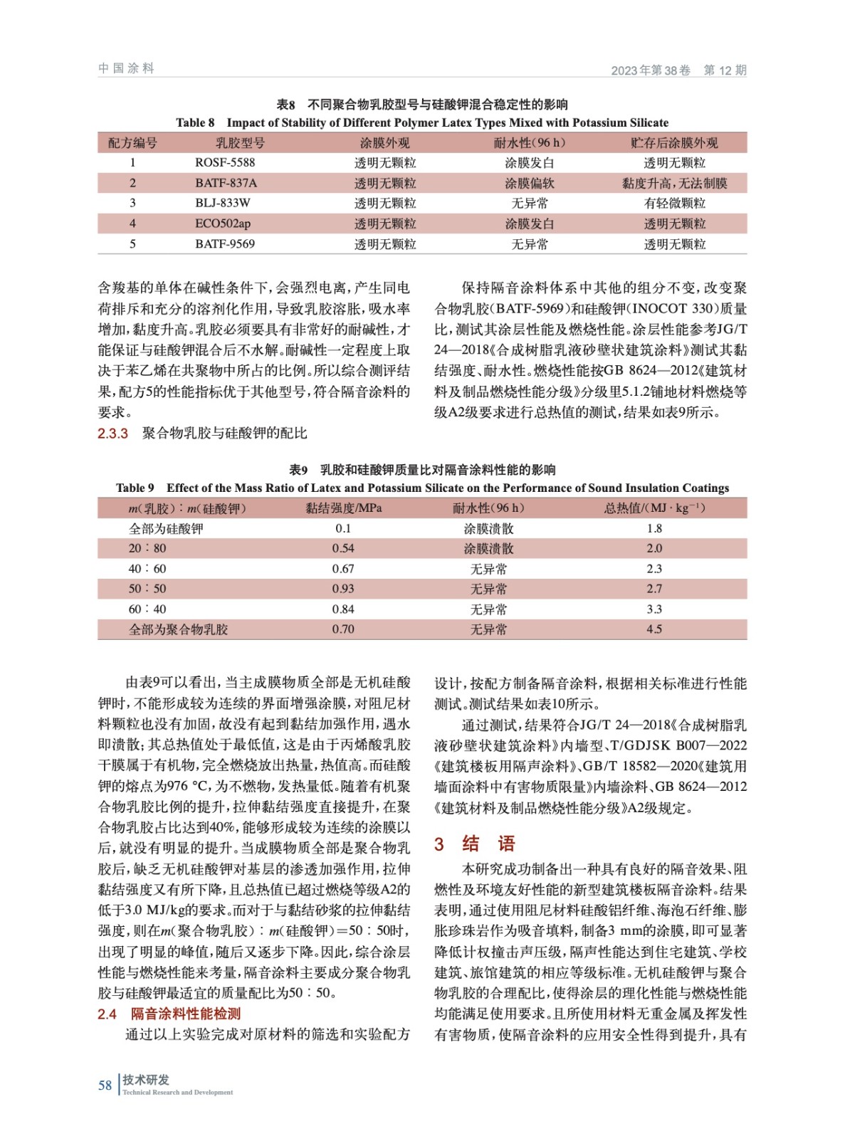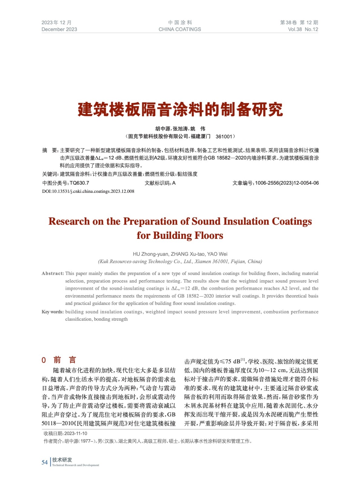 摘要:主要研究了一種新型建筑樓板隔音涂料的制備,包括材料選擇、制備工藝和性能測試。結果表明,采用該隔音涂料計權撞擊聲壓級改善量ΔLw=12 dB、燃燒性能達到A2級,環境友好性能符合GB 18582—2020內墻涂料要求。為建筑樓板隔音涂料的應用提供了理論依據和實際指導。
