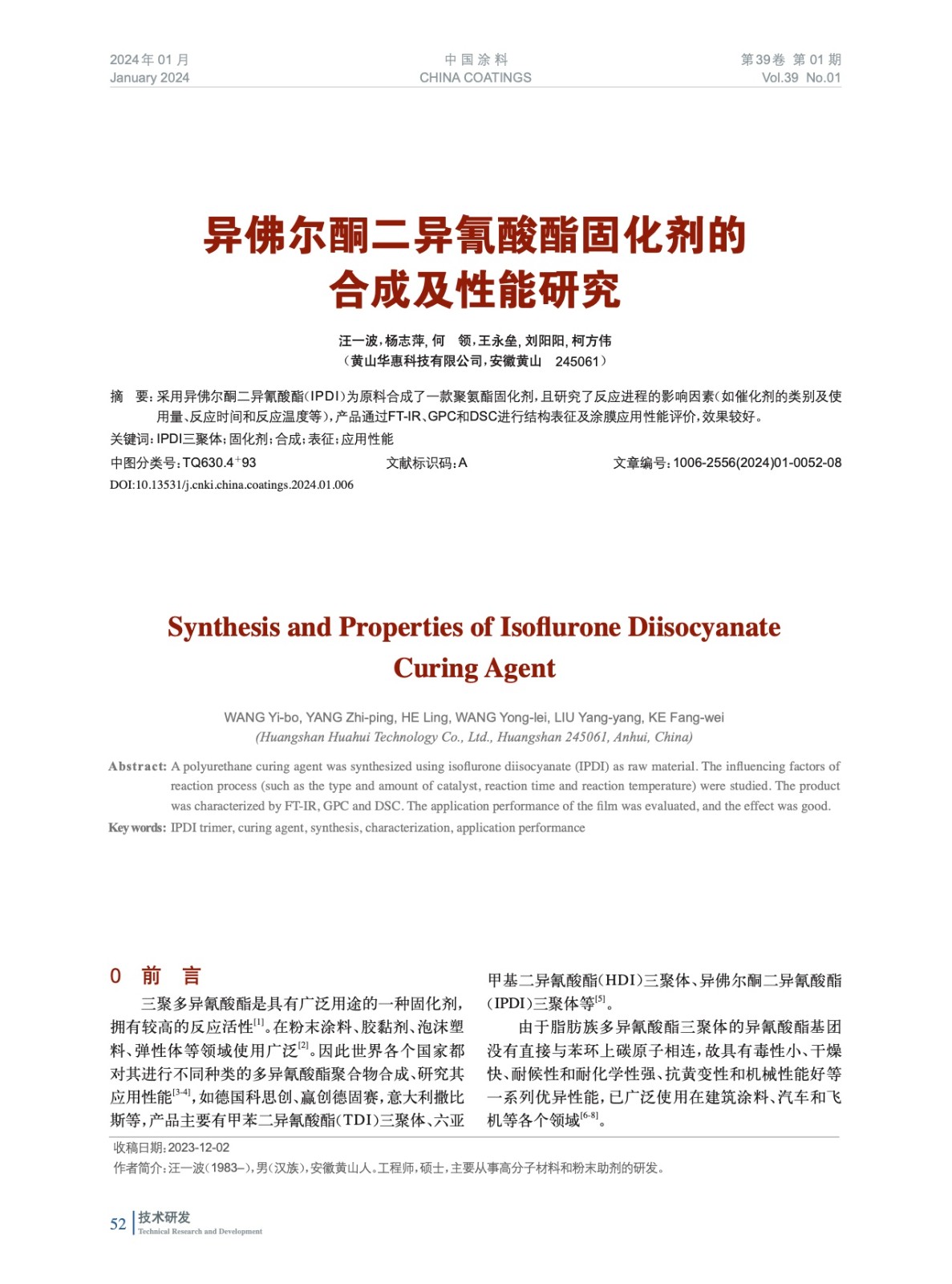 異佛爾酮二異氰酸酯固化劑的合成及性能研究