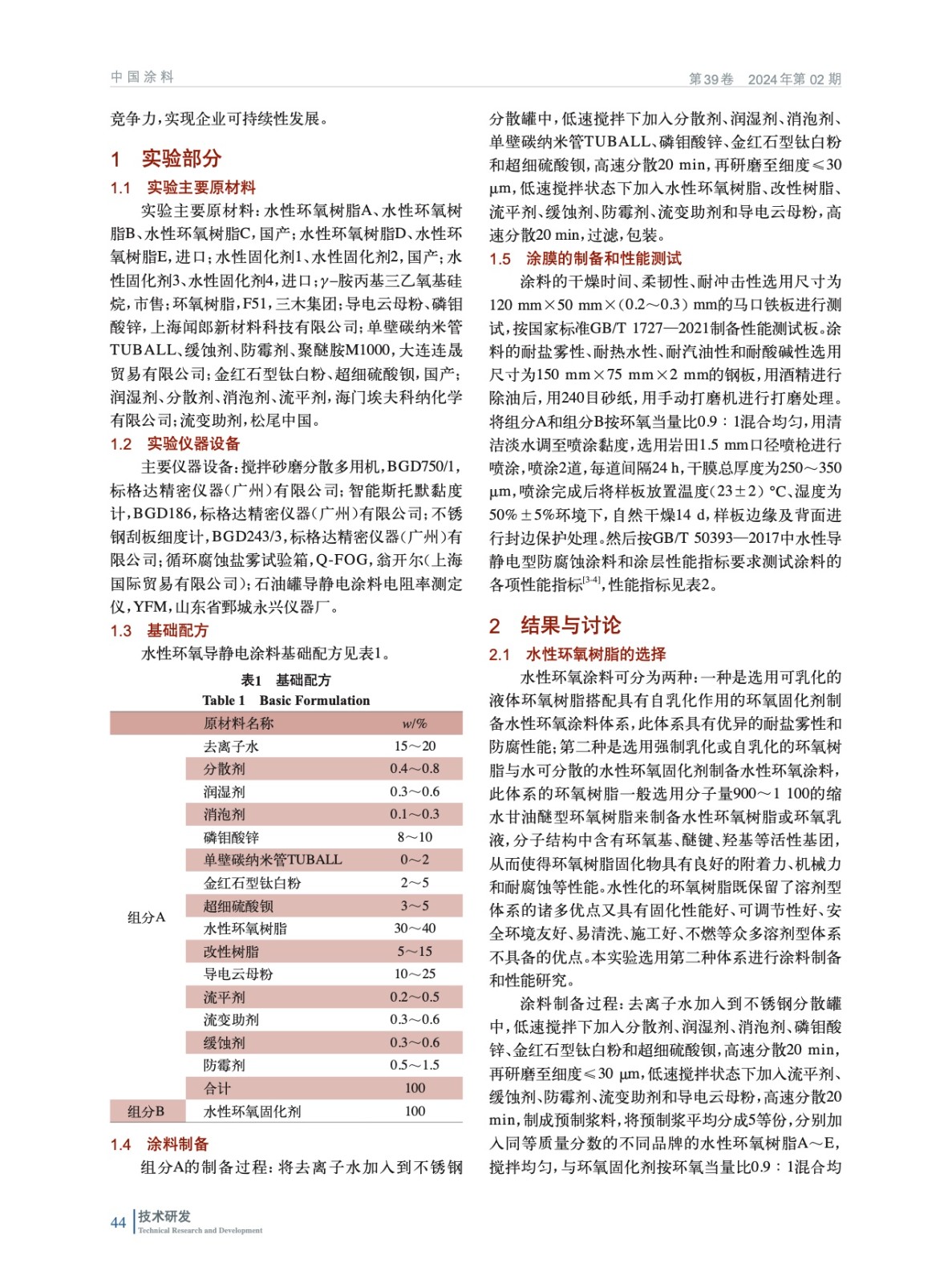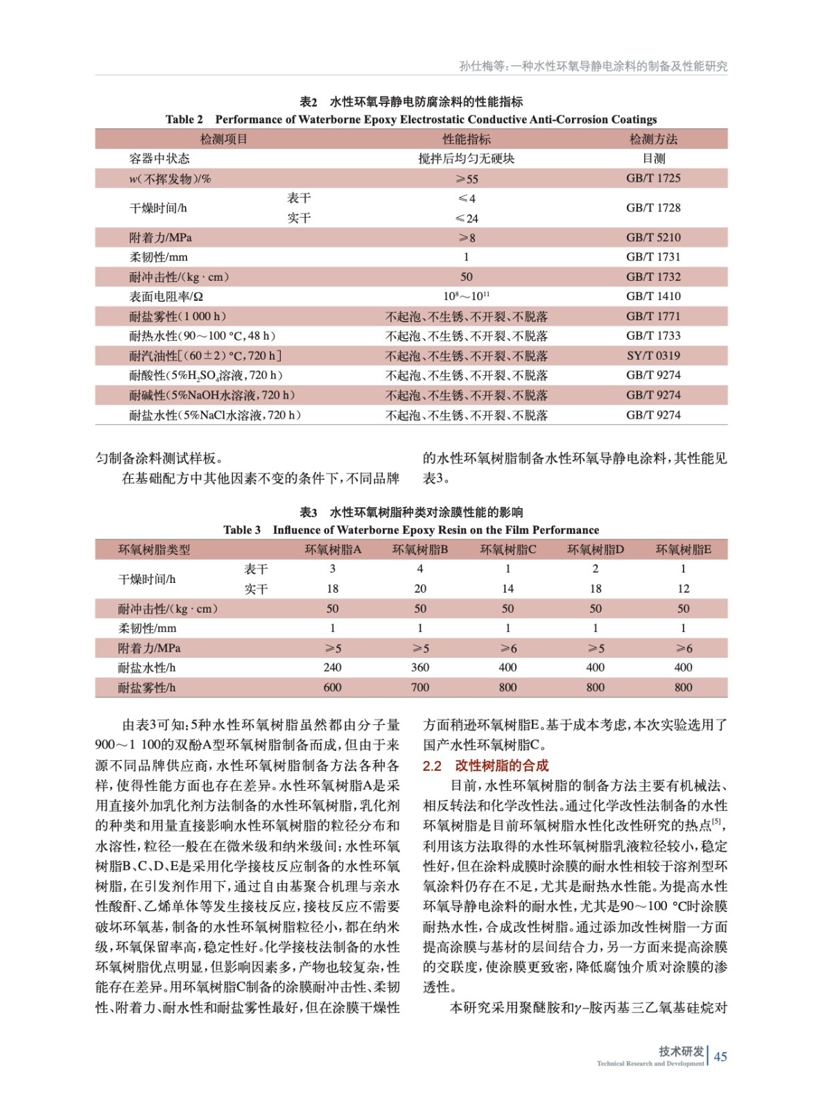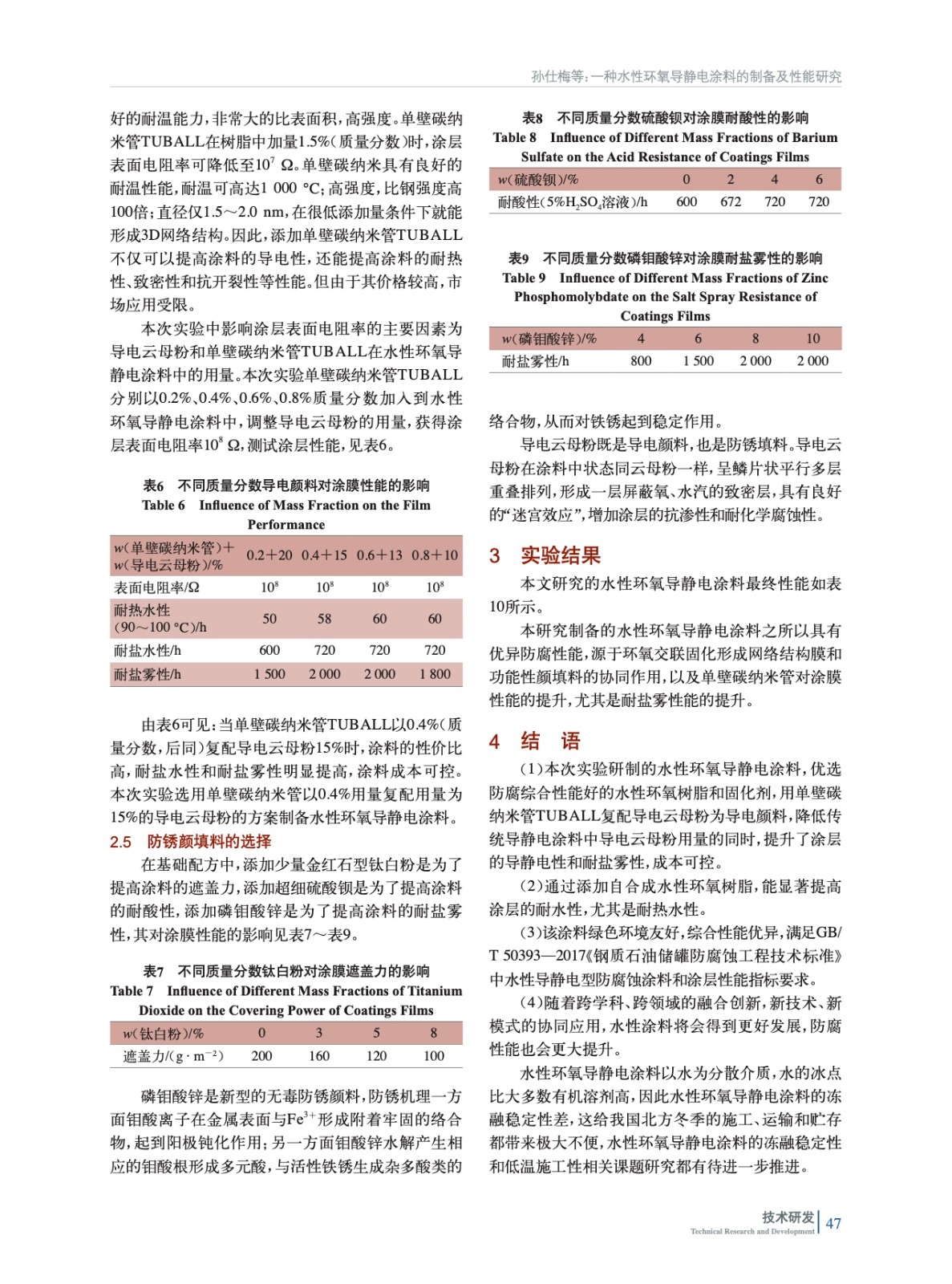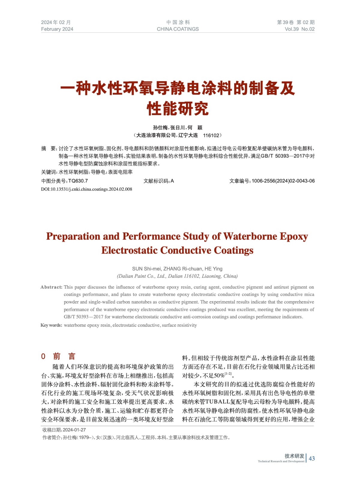 摘要:討論了水性環氧樹脂、固化劑、導電顏料和防銹顏料對涂層性能影響,擬通過導電云母粉復配單壁碳納米管為導電顏料,制備一種水性環氧導靜電涂料。實驗結果表明,制備的水性環氧導靜電涂料綜合性能優異,滿足GB/T 50393—2017中對水性導靜電型防腐蝕涂料和涂層性能指標要求。