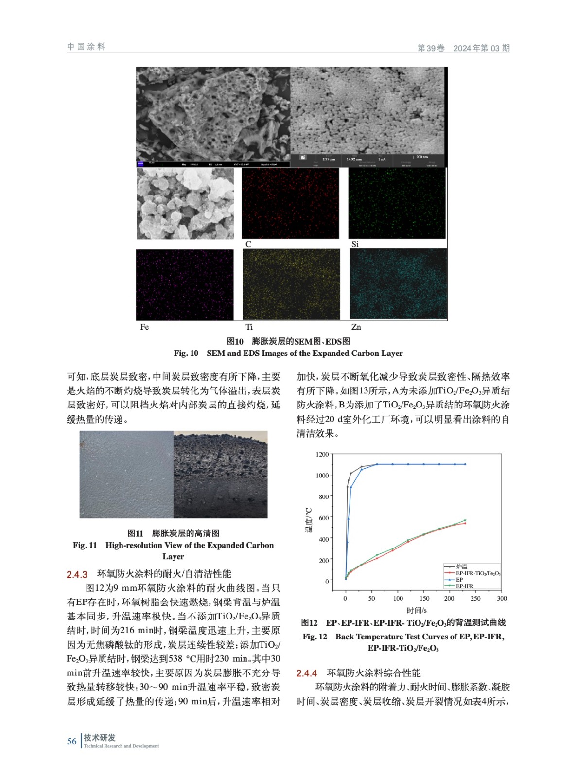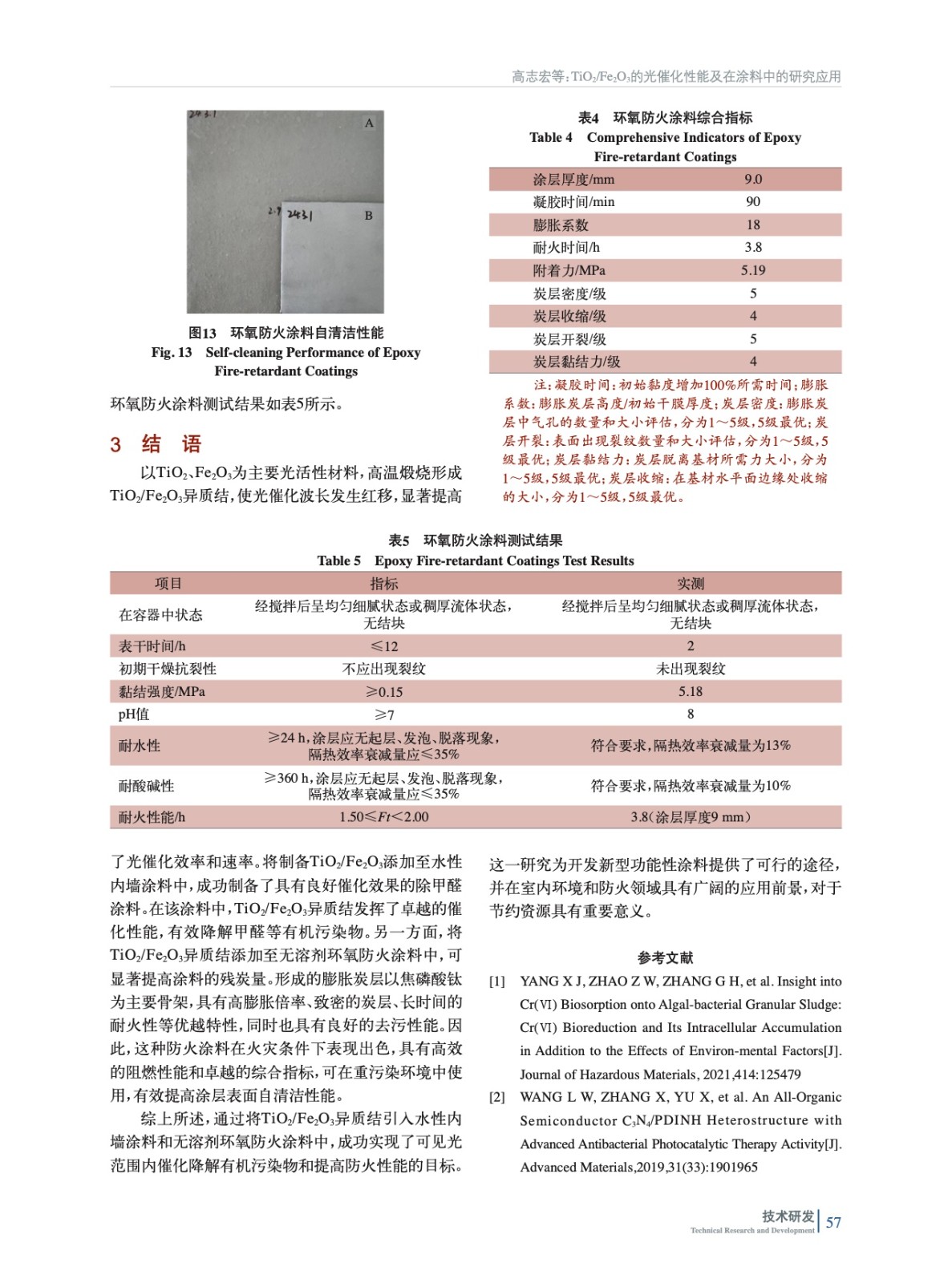 摘要:采用水熱法合成TiO2、Fe2O3的前聚體,并通過高溫煅燒制備了TiO2/Fe2O3異質結,通過XRD、SEM、TEM等一系列表征TiO2、Fe2O3的形成,紫外–漫反射光譜圖表明,TiO2/Fe2O3異質結在可見光范圍內吸光性能較TiO2和Fe2O3明顯紅移。通過Tauc曲線、Mott-Schottky曲線理論計算得出TiO2/Fe2O3異質結的形成,該異質結對甲基橙的180 min催化率為94%,可見光范圍內表現出卓越的光催化活性。在內墻涂料中添加質量比為1∶100時對甲醛24 h 光催化降解效率為89.6%,TiO2/Fe2O3異質結在高溫煅燒下形成一種優良的耐高溫填料,因此在防火涂料中的應用顯著增強了其阻燃抑煙性能。在防火涂料中的添加質量比為2.5∶100時,防火涂料的殘炭量從35%提升至39%,環氧防火涂料9.0 mm耐火230 min,呈現出良好的防火性能,環氧涂層黏結力強,耐久性、機械性好,膨脹炭層強度高、致密性好,TiO2/Fe2O3異質結存在還使該防火涂料具有良好的自清潔性能。