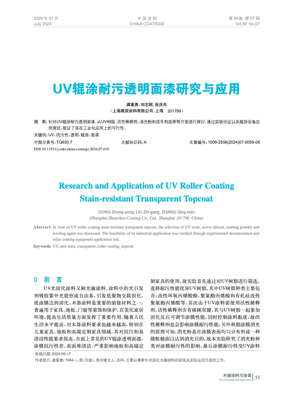 對UV輥涂耐污透明面漆,從UV樹脂、活性稀釋劑、消光粉和流平劑選擇等方面進行探討,通過實驗論證以及輥涂設備應用測試,驗證了其在工業化應用上的可行性。