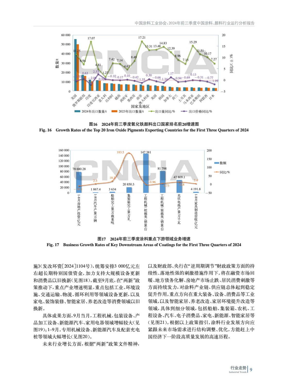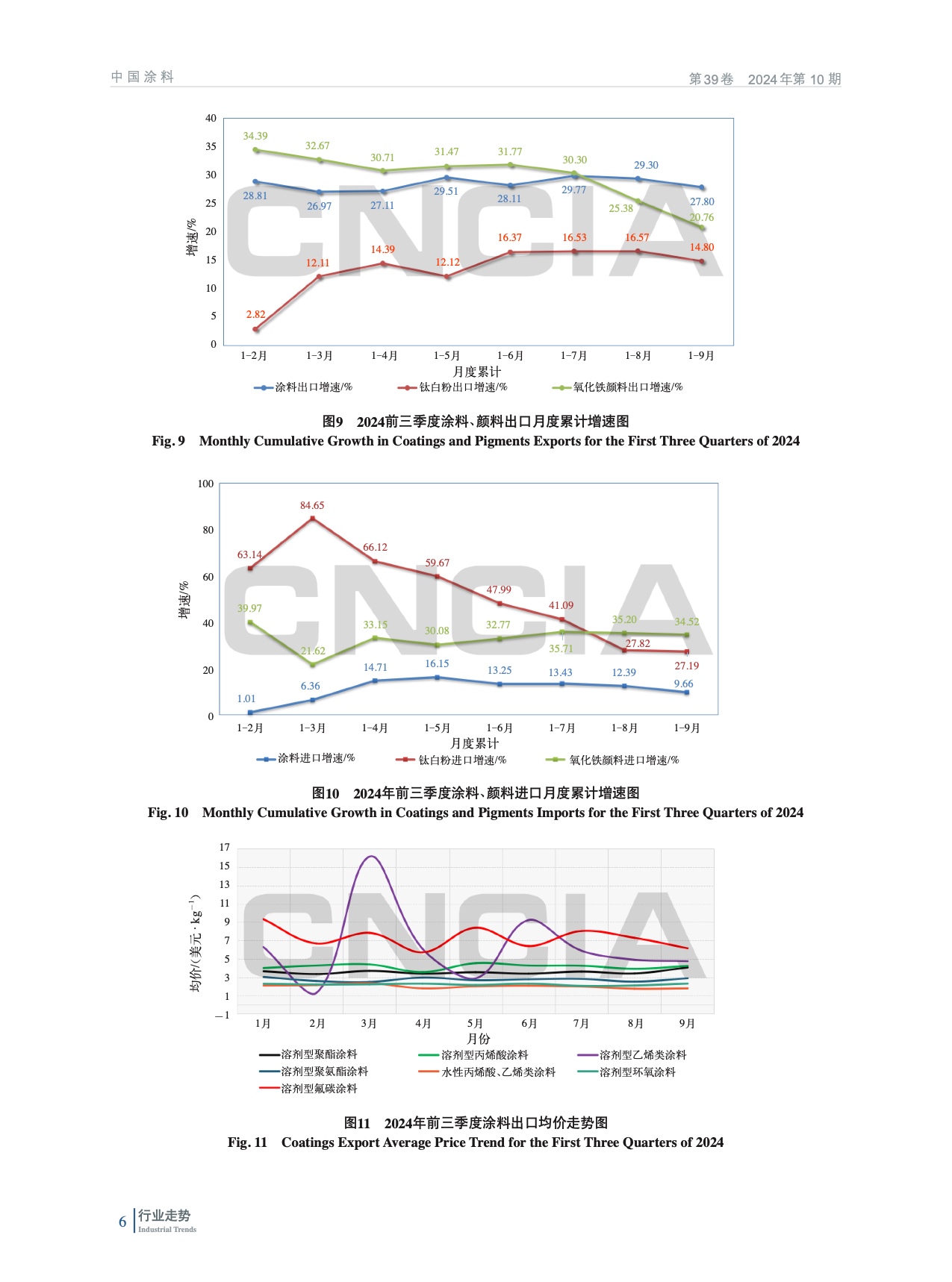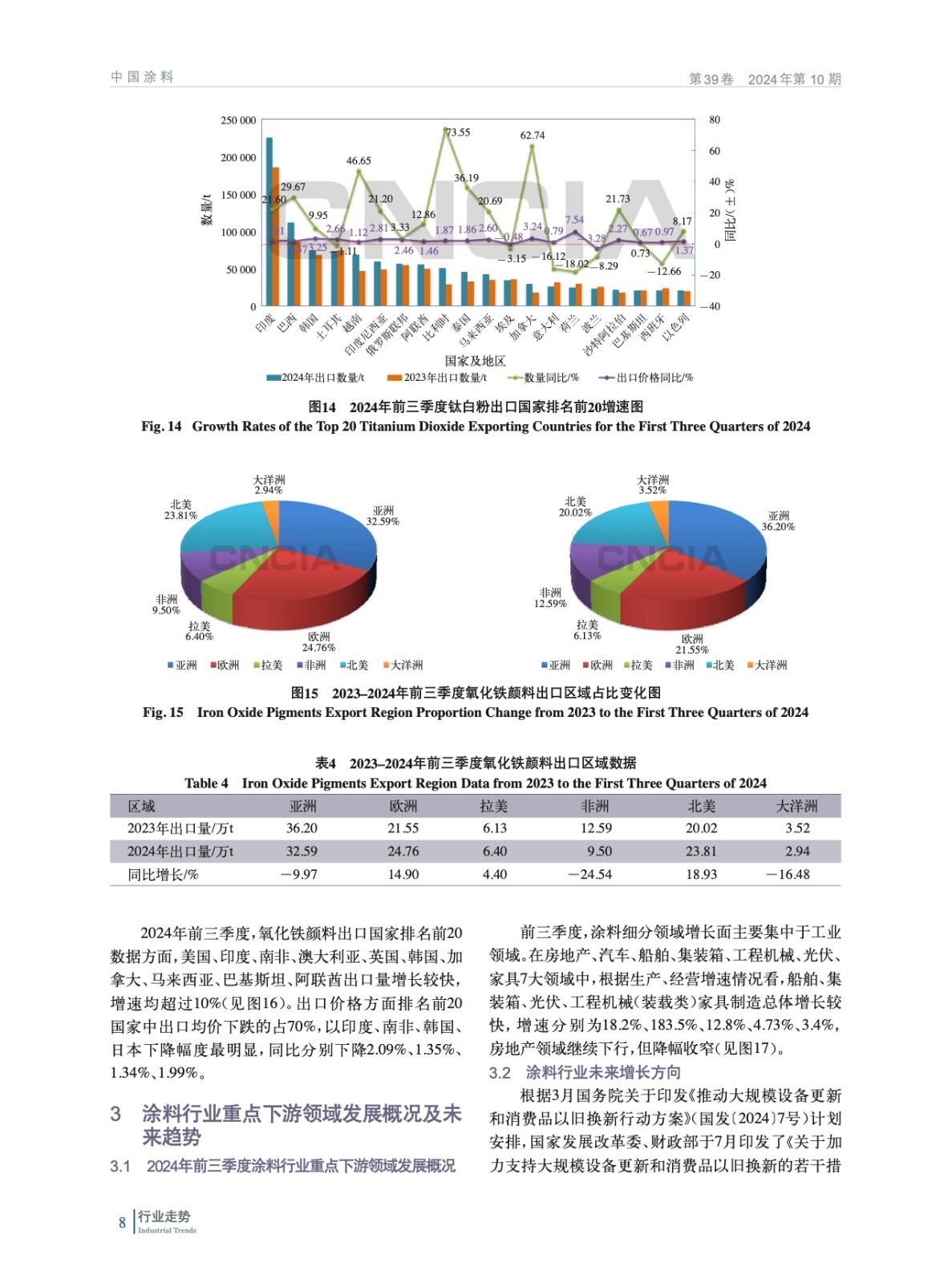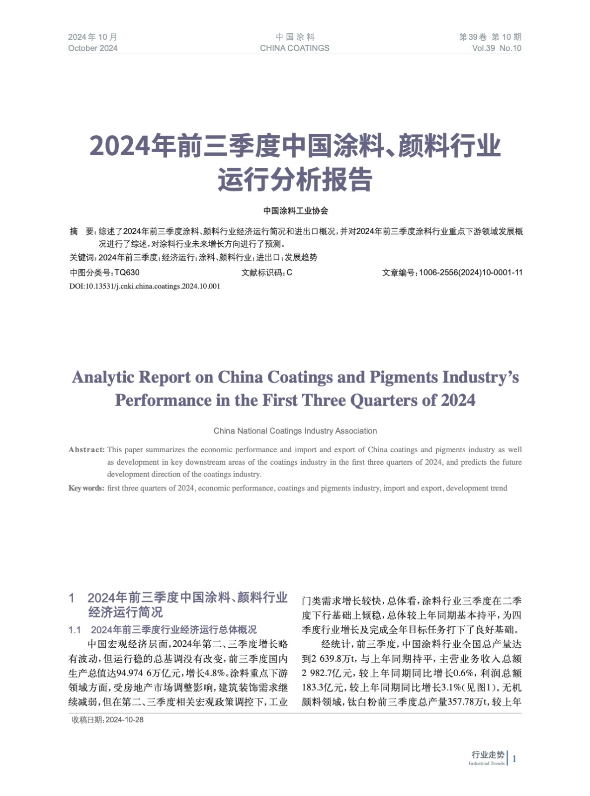 摘要:綜述了2024年前三季度涂料、顏料行業經濟運行簡況和進出口概況,并對2024年前三季度涂料行業重點下游領域發展概況進行了綜述,對涂料行業未來增長方向進行了預測。
