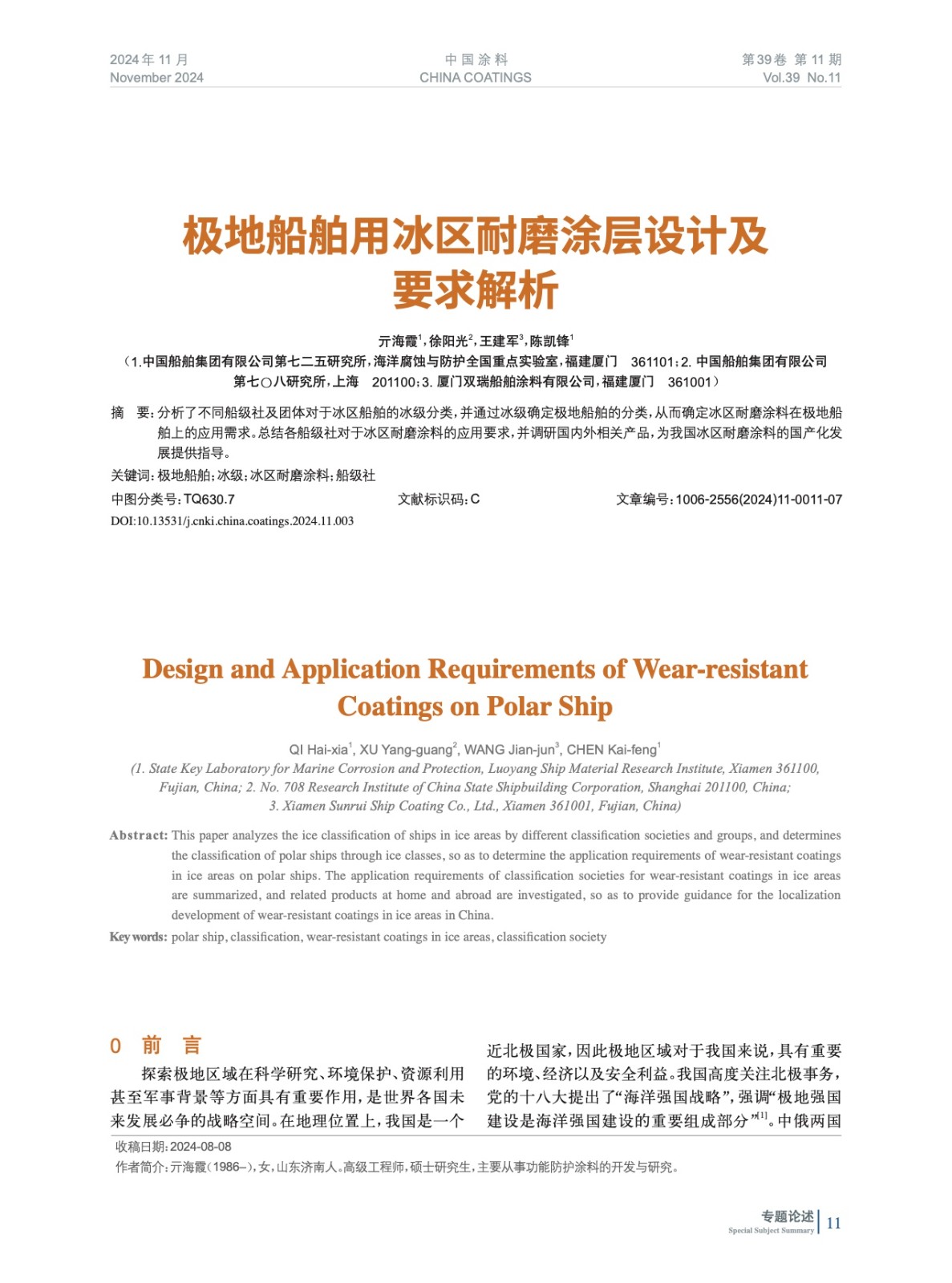 摘要:分析了不同船級社及團體對于冰區(qū)船舶的冰級分類,并通過冰級確定極地船舶的分類,從而確定冰區(qū)耐磨涂料在極地船舶上的應用需求。總結各船級社對于冰區(qū)耐磨涂料的應用要求,并調研國內(nèi)外相關產(chǎn)品,為我國冰區(qū)耐磨涂料的國產(chǎn)化發(fā)展提供指導。