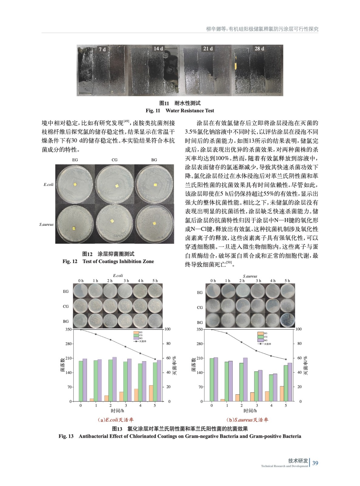 摘要:本研究基于導電涂層防污技術,提出“酰胺基儲氯結構+碳管導電網絡”協同機制,開發了可儲氯釋氯防污涂層,實現了防生物污損與生態安全的統一。以可在次氯酸溶液中將N—H鍵轉化為N—Cl鍵的N–鹵胺化合物為核心儲氯單元,結合多壁碳納米管(MWCNTs)構建導電網絡,采用溶膠–凝膠法進行硅烷水解構筑復合涂層基底。突破傳統涂層的單一作用模式,將MWCNTs導電涂層作為陽極,在外加電場下電解海水原位生成次氯酸根,與N–鹵胺儲氯體系形成協同防污機制。并通過電化學測試定量解析了海水環境中MWCNTs導電涂層的析氯電位,驗證了該體系在低能耗條件下持續產氯的可行性。實驗結果表明,涂層經2.5 V電解15 min將N—H鍵向N—Cl鍵轉化完成儲氯后,涂層有效氯儲存量達79.8 mg/m2,對大腸桿菌和金黃色葡萄球菌的接觸殺滅率均達100%,海水中浸泡5 h后依然有55%以上的細菌殺滅率。一次儲氯可維持有效氯勻速緩釋26 h,12 h內有效抑制生物膜的形成。通過掃描電子顯微鏡(SEM)證實,MWCNTs在涂料體系的導電通路的基本單元是由“團聚體–通道”所構成的,形成了完善的導電網絡。X射線光電子能譜(XPS)與傅里葉變換紅外光譜(FTIR)表征數據共同揭示了涂層中N—Cl鍵的穩定存在。