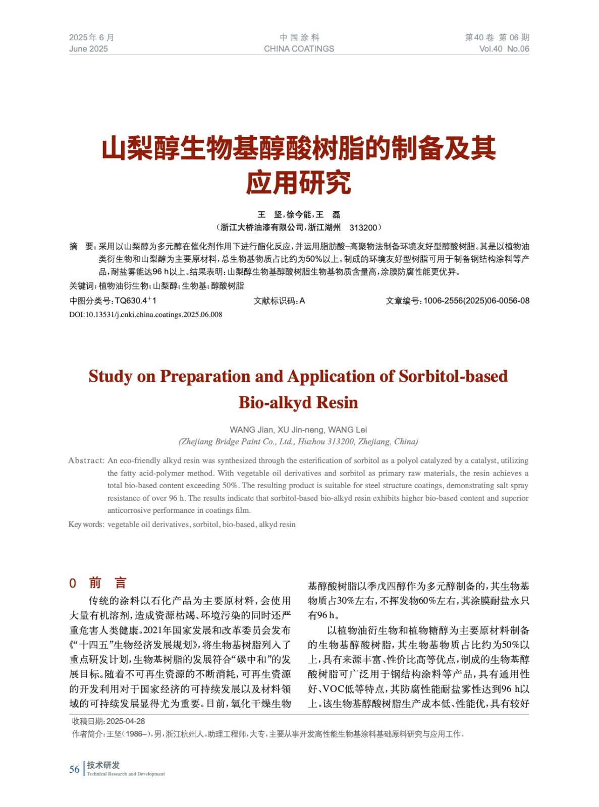 山梨醇生物基醇酸樹脂的制備及其應用研究