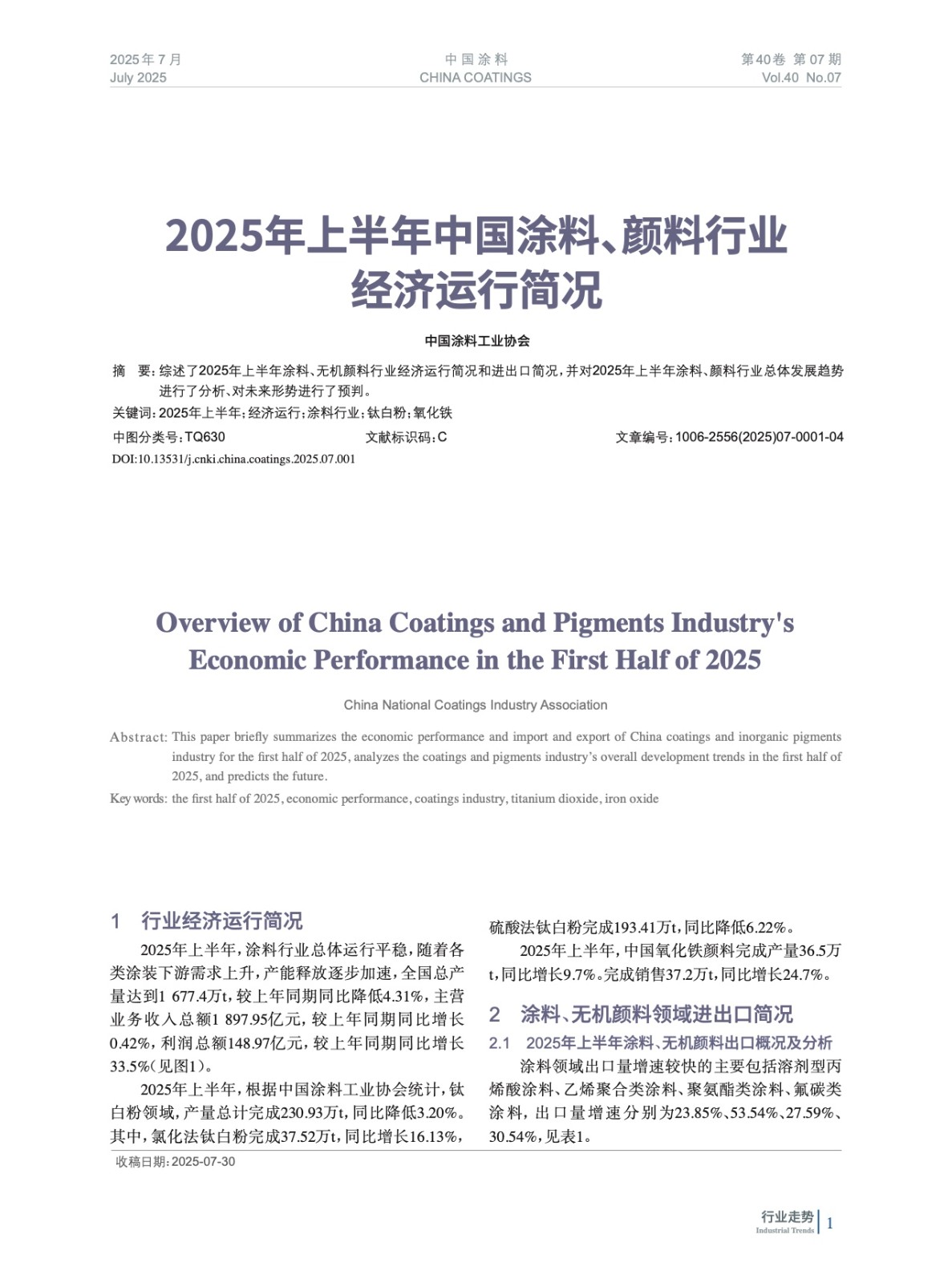 綜述了2025年上半年涂料、無機顏料行業經濟運行簡況和進出口簡況,并對2025年上半年涂料、顏料行業總體發展趨勢進行了分析、對未來形勢進行了預判。