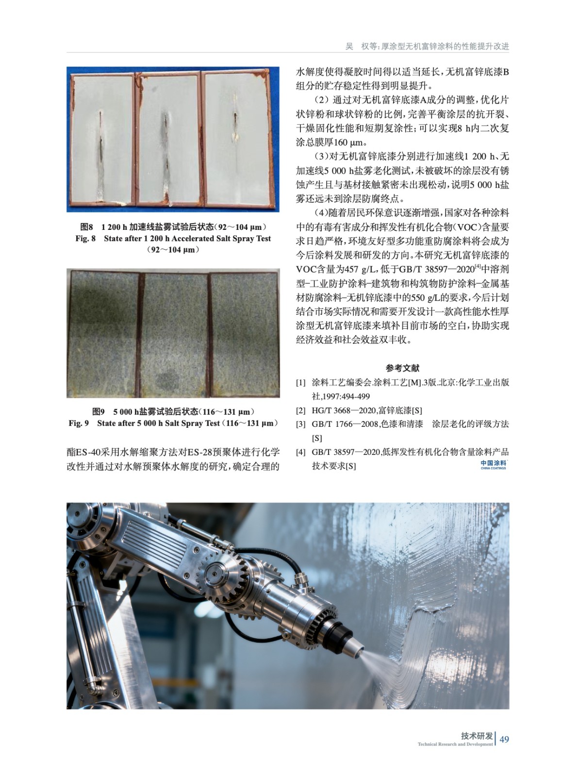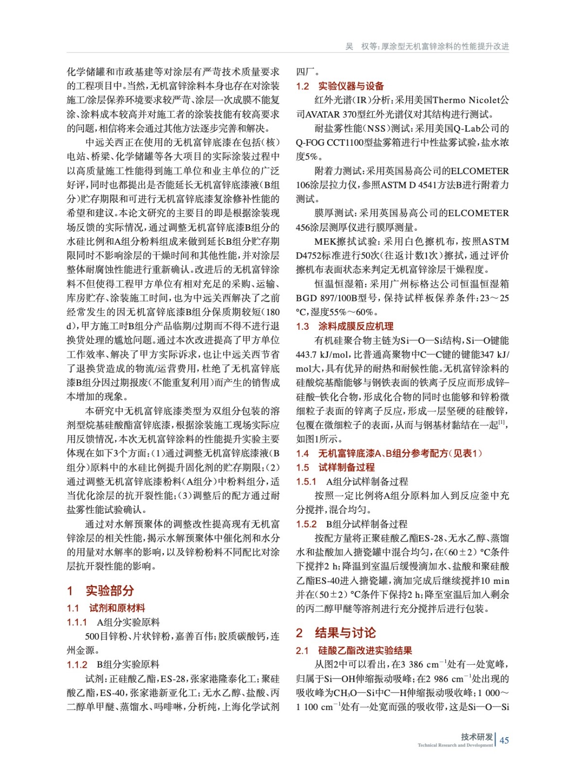 摘要:主要研究無機富鋅涂料的性能提升,探索制備具有耐腐蝕性強、厚涂不開裂和貯存穩定性好并在一定條件下可復涂同種涂料的高性能無機富鋅底漆。采用多種實驗測試方法對研制的無機富鋅涂層性能進行分析檢測,最終得到滿足各大項目現場實際需求的、各項性能優異的無機富鋅產品。