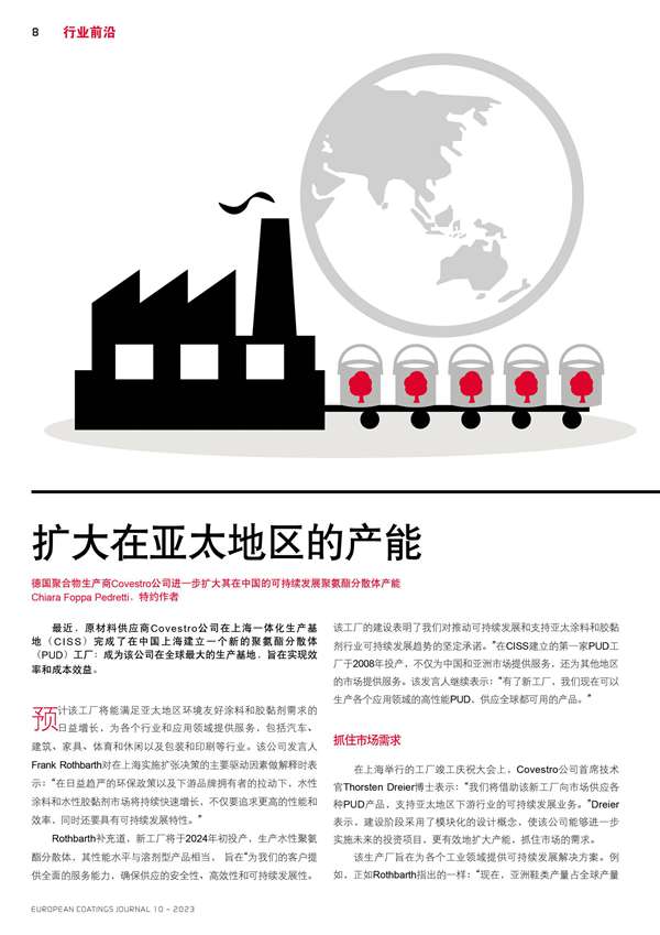 Covestro公司進一步擴大其在中國的聚氨酯分散體產能