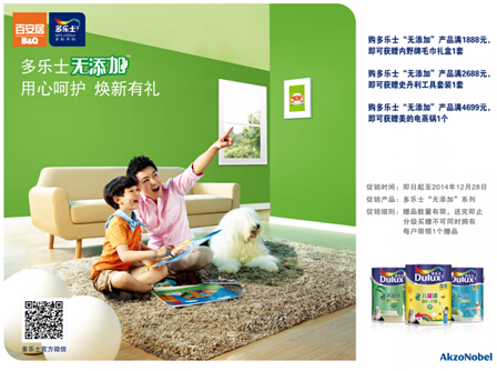 為了能讓更多的家庭享受和體驗(yàn)多樂(lè)士環(huán)保無(wú)添加產(chǎn)品的優(yōu)異環(huán)保品質(zhì),從即日起到2014年12月28日多樂(lè)士聯(lián)合百安居,在廣州、深圳百安居指定門(mén)店舉行“多樂(lè)士無(wú)添加,用心呵護(hù),煥新有禮”的大型團(tuán)購(gòu)活動(dòng)。以豐厚的回饋感謝廣大消費(fèi)者對(duì)多樂(lè)士無(wú)添加的喜愛(ài)和關(guān)注。