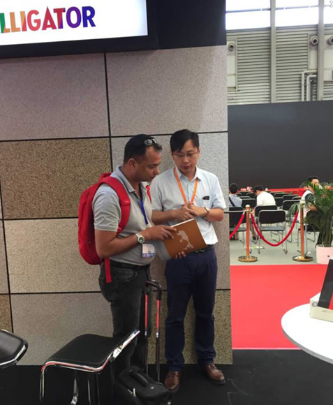 展會的另一大亮點:鼎彩漆。此次鼎彩漆展示采用真的石頭和鼎彩漆涂料樣板對比的形式,鱷魚鼎彩漆樣板與石材幾乎亂真的表面紋理效果,充分體現出石材的厚重感的同時由于其涂層薄,自重輕,不影響建筑物的承重,深受甲方歡迎。在所有參觀者中有一位來自尼泊爾的買家給我們留下了深刻的印象,由于語言的限制,深諳英語口語的工程師王律擔任了接待這位客戶的重擔,相信王工流利的口語、專業的產品知識解答也同樣給尼泊爾買家一個的印象。