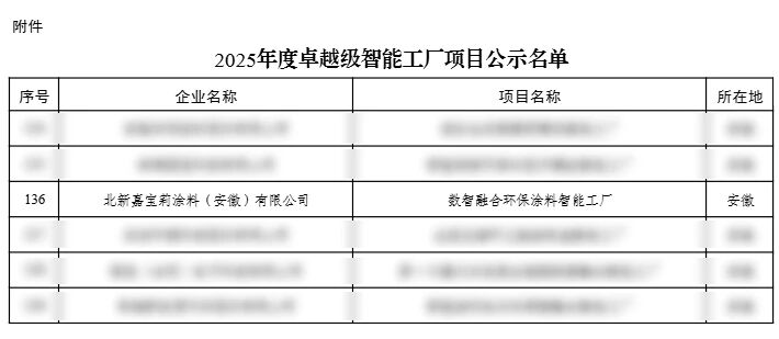 近日,工信部正式公示了2025年度卓越級智能工廠項目名單。經過多輪嚴格評審,北新嘉寶莉涂料(安徽)有限公司打造的“數智融合環保涂料智能工廠”成功入選。