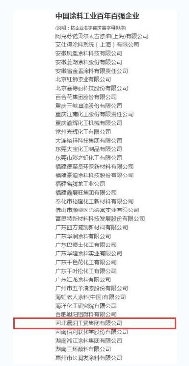 10月10日,由中國涂料工業(yè)協(xié)會主辦的中國涂料工業(yè)百年百強評選活動結(jié)果公布,晨陽水漆當選“中國涂料工業(yè)百年百強企業(yè)”榮譽稱號。