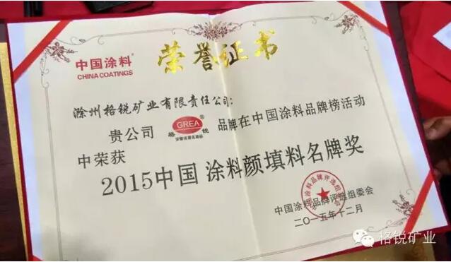 格銳礦業(yè)榮獲"2015年中國(guó)涂料顏填料名牌獎(jiǎng)"