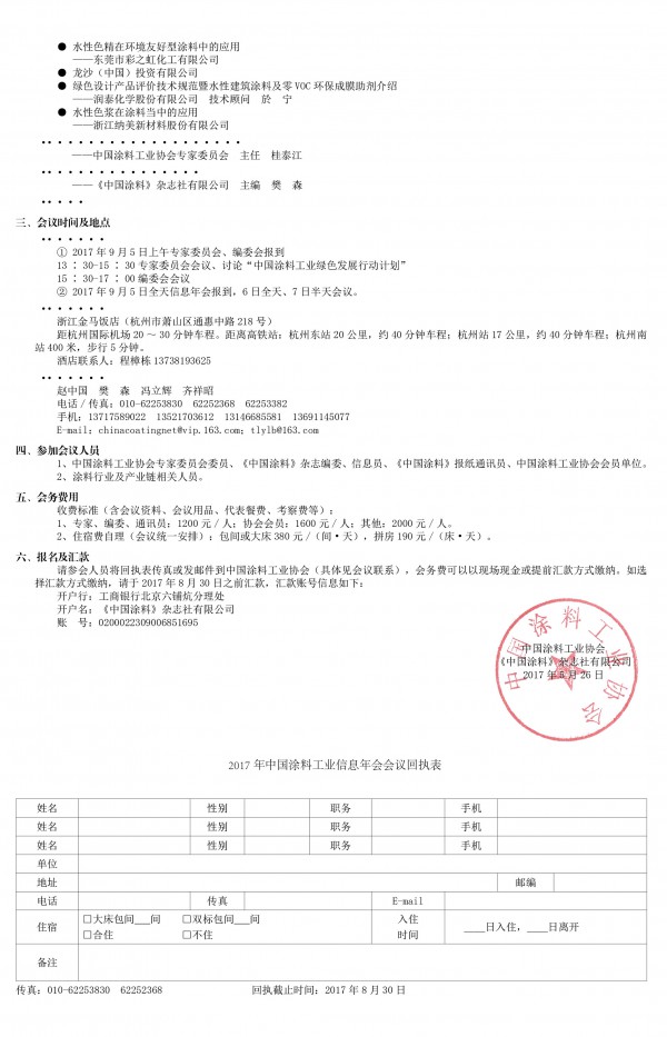請(qǐng)參會(huì)人員將回執(zhí)表傳真或發(fā)郵件到中國(guó)涂料工業(yè)協(xié)會(huì)(具體見(jiàn)會(huì)議聯(lián)系),會(huì)務(wù)費(fèi)可以以現(xiàn)場(chǎng)現(xiàn)金或提前匯款方式繳納。如選擇匯款方式繳納,請(qǐng)于2017年8月30日之前匯款,匯款賬號(hào)信息如下: