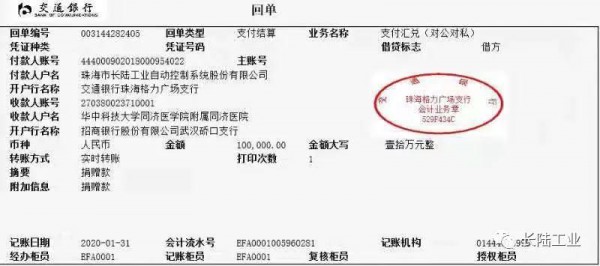 武漢疫情的發(fā)展也牽動(dòng)著長(zhǎng)陸人的心,今天,珠海市長(zhǎng)陸工業(yè)自動(dòng)控制系統(tǒng)股份有限公司(簡(jiǎn)稱長(zhǎng)陸工控)向武漢市華中科技大學(xué)同濟(jì)醫(yī)學(xué)院附屬同濟(jì)醫(yī)院捐贈(zèng)人民幣10萬(wàn)元,用于開(kāi)展抗擊新型冠狀病毒感染的肺炎疫情之需,長(zhǎng)陸公司希望以此為抗擊疫情盡一份綿薄之力。