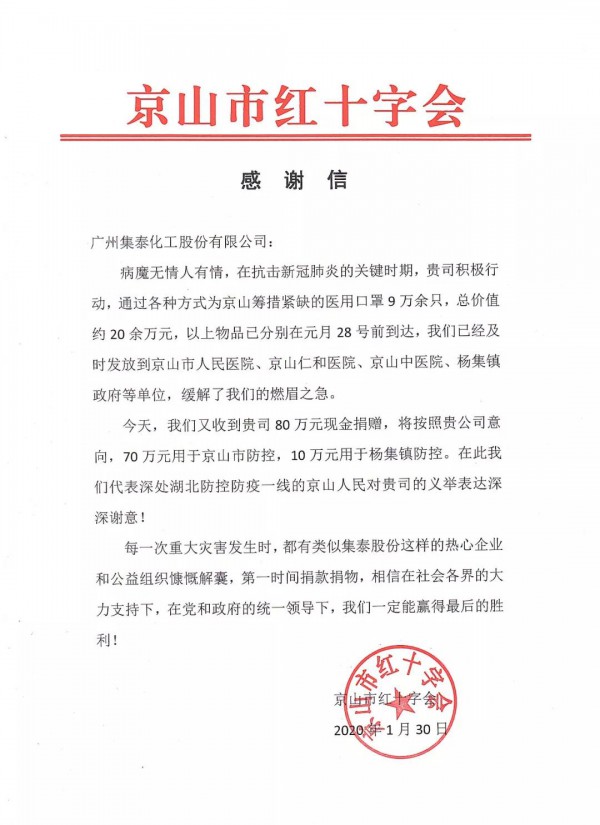 京山紅十字會在感謝信中表示,在抗擊新型肺炎的關鍵時期,集泰股份積極行動,通過各種方式為京山籌措緊缺的醫用口罩,緩解了前線的燃眉之急。80萬的現金捐贈他們將用于京山市及楊集鎮防控防疫,他們代表身處湖北防控防疫一線的京山人民對集泰股份的義舉深表感謝!