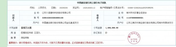 萬眾一心,眾志成城。2020年2月5日,久諾人向常州市光彩事業促進會捐助100萬元現金,用于武漢等地區疫情防控工作。目前該筆款項已經到賬!