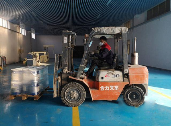 此時,員工何海山開著叉車過來了,正準備將剩下的一包防火涂料裝上車。“每包涂料22桶,都是工人們加班加點生產出來的。”何海山心里有數,他已往車上裝了14包。