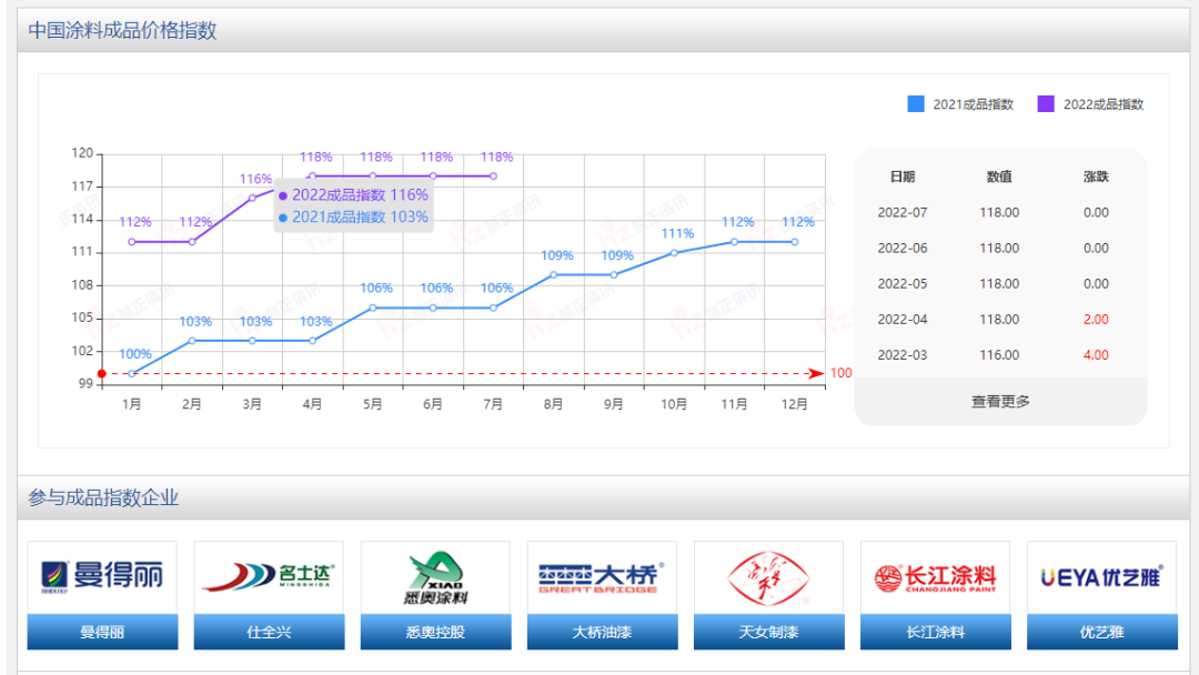 成品價(jià)格指數(shù),通過對重點(diǎn)品牌涂料產(chǎn)品的流通價(jià)格進(jìn)行收集,經(jīng)過有效篩選和科學(xué)算法統(tǒng)計(jì),與基準(zhǔn)數(shù)據(jù)進(jìn)行對比后形成。統(tǒng)計(jì)品類包括了建筑涂料、防水涂料、工業(yè)涂料、防腐涂料、地坪涂料、船舶涂料、木器涂料、汽車涂料、粉末涂料、集裝箱涂料、卷鋼涂料及包裝涂料在內(nèi)的主要涂料產(chǎn)品。