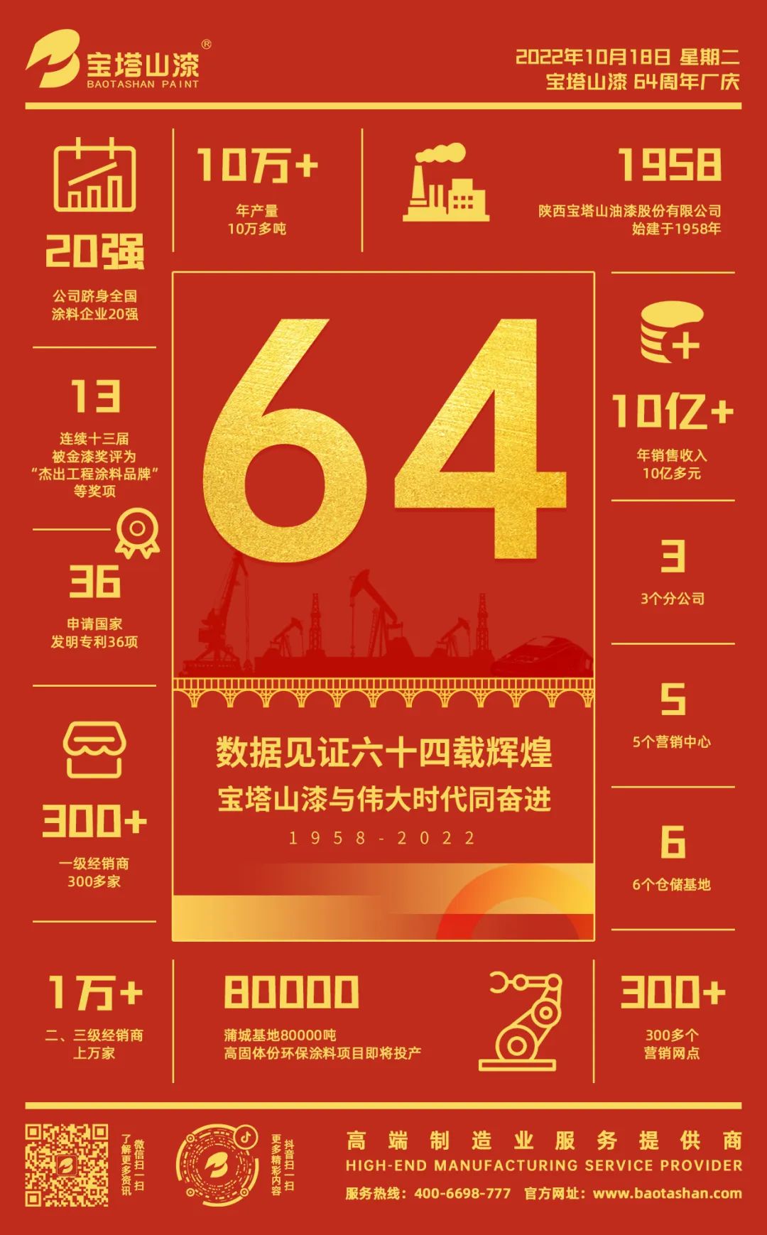2022年10月18日,金秋十月,繁華似錦,乘著中國共產黨領導下的新時代風云,陜西寶塔山油漆股份有限公司迎來了六十四歲生日,與偉大時代同奮進,創一流民族品牌。