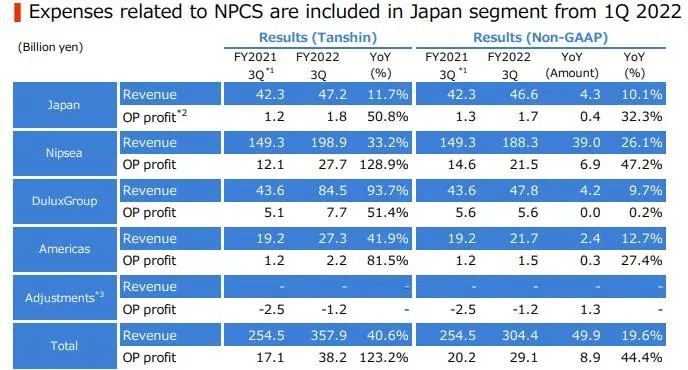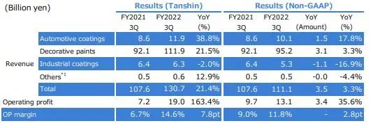 前三季度由于半導體芯片短缺和其他因素導致汽車生產數量下降,導致日本本土的汽車涂料銷售收入下降。受新建住宅開工穩定和其他有利市場條件的推動,工業涂料收入增加。由于市場條件的改善,裝飾涂料收入也有所增加。