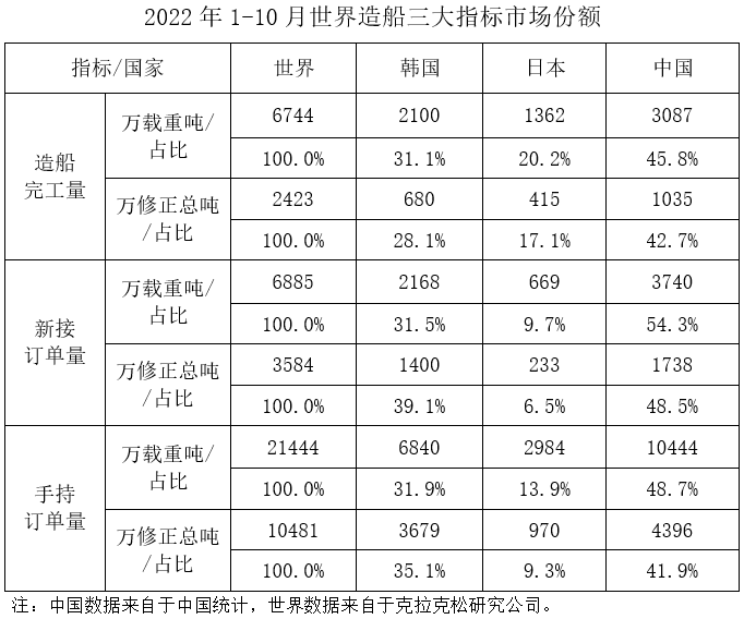 按修正總噸計,中國造船完工量、新接訂單量、手持訂單量分別占世界市場份額的42.7%、48.5%和41.9%。