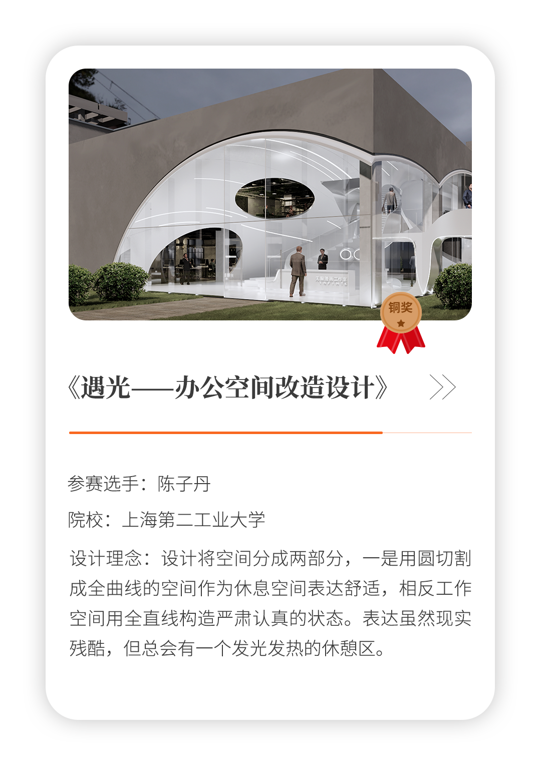 該作品提取《盜夢空間》中經典的夢境的世界觀,以層層嵌套的夢境為深入線索,運用具象與抽象相結合、空間內部與空間邊界虛實變化等方式,塑造出一個遠離真實世界的第三世界——沉浸式酒吧。作品通過獨特的空間結構、色彩與材質的創意性突破,營造出了一個有利于身心放松的室內空間環境,希望客人們在一天的繁忙勞碌之后走進酒吧,能夠像進入夢鄉沉浸于夢中那般的愉悅,與空間進行更深層次的交互,充分展示了出未來理想人居空間的藍圖。
