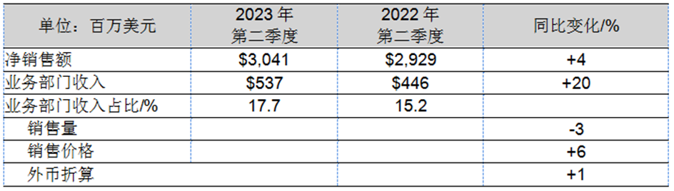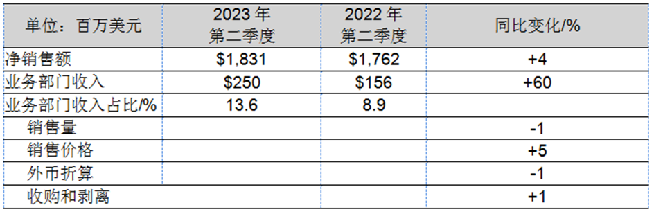 與上年相比,工業領域涂料業務部門的收入增長了9400萬美元,增長率達60%,主要原因在于銷售價格上漲和原材料成本增長放緩。與2022年第二季度相比,該業務部門的利潤率提高了470個基點。